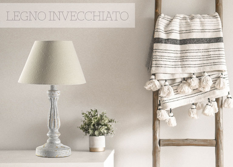 La particolarità delle lampade Raffy è data dalle basi in legno bianco, su cui è presente un piacevole effetto invecchiato, e dai paralumi, che sono invece di forma conica e in stoffa di cotone color sabbia.