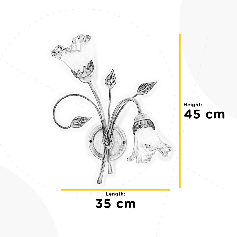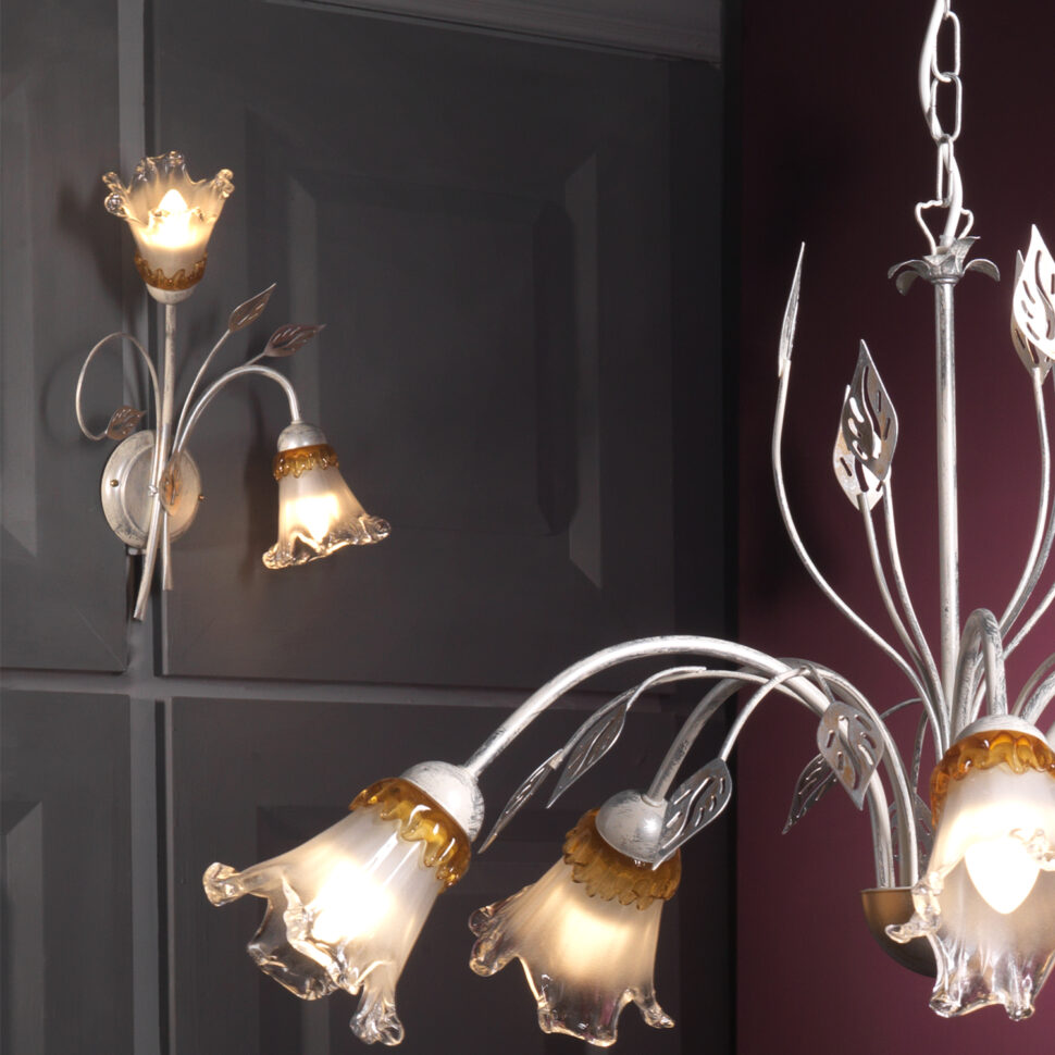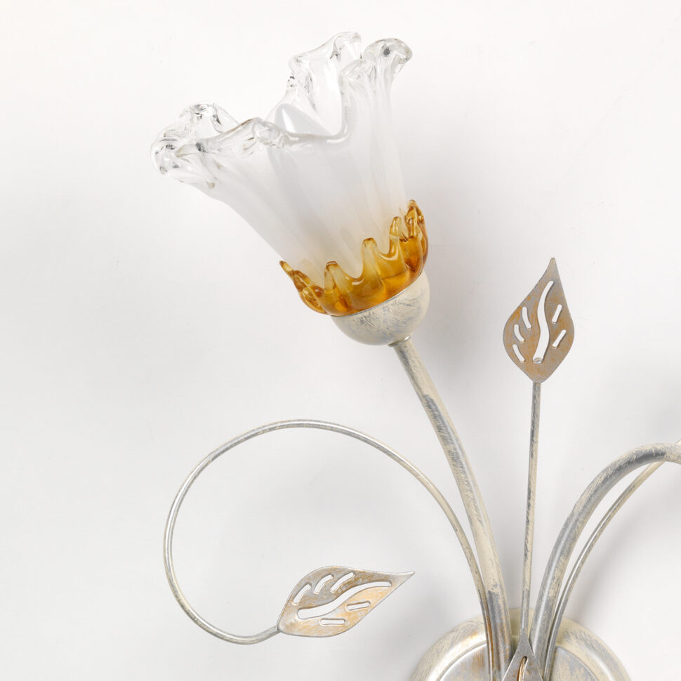 Lampada da parete a 2 luci con un paralume rivolto verso il basso e uno verso l'alto, per favorire una maggiore diffusione della luce. Struttura bianca spennellata argento e oro, a riprendere l'ambra delle calle in vetro. Perfetta per corridoi, sale e camere da letto.