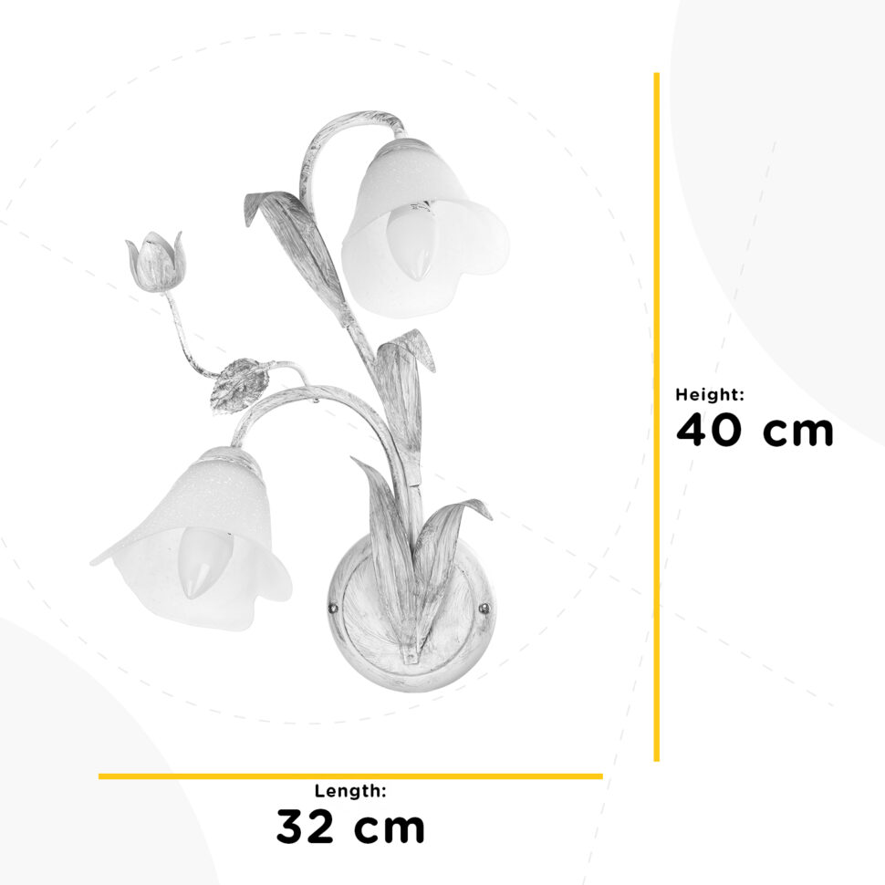 Lampada da parete a 2 luci con attacco E14. I due bracci dove sono presenti le luci sono rivolti verso il basso. Le decorazioni floreali rendono il prodotto elegante e affascinante. Ideale per corridoi, salotti e camere da letto spaziose. Alta 40 cm, larga 32 cm e profonda 18 cm.