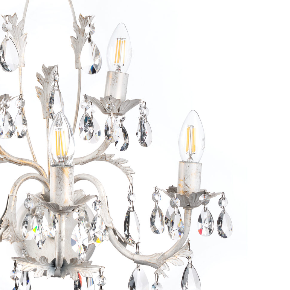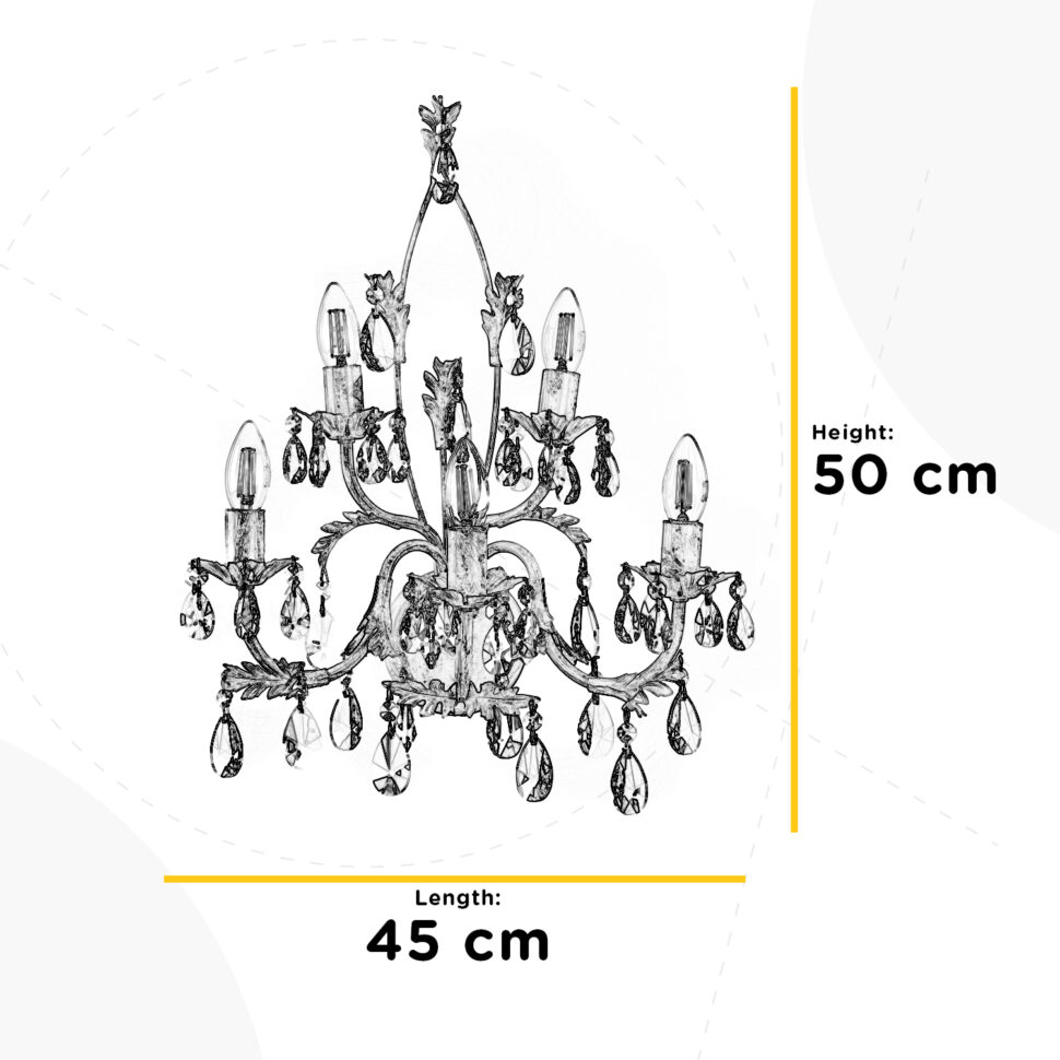 Gli attacchi per le luci sono E14, le lampadine vanno posizionate sopra delle decorazioni floreali: sono 3 in avanti e 2 leggermente dietro. Questi due gruppi di lampadine si posizionano a due altezze diverse, il che dona movimento alla lampada. La disposizione delle linee della lampada ricordano vagamente una fiamma. Le gocce di cristallo sono tante e sono vicino soprattutto ai punti luce. Sono di due dimensioni, 38 mm e 50 mm, e completano gli elementi decorativi, pendono infatti dalle piccole foglie che caratterizzano l'applique.