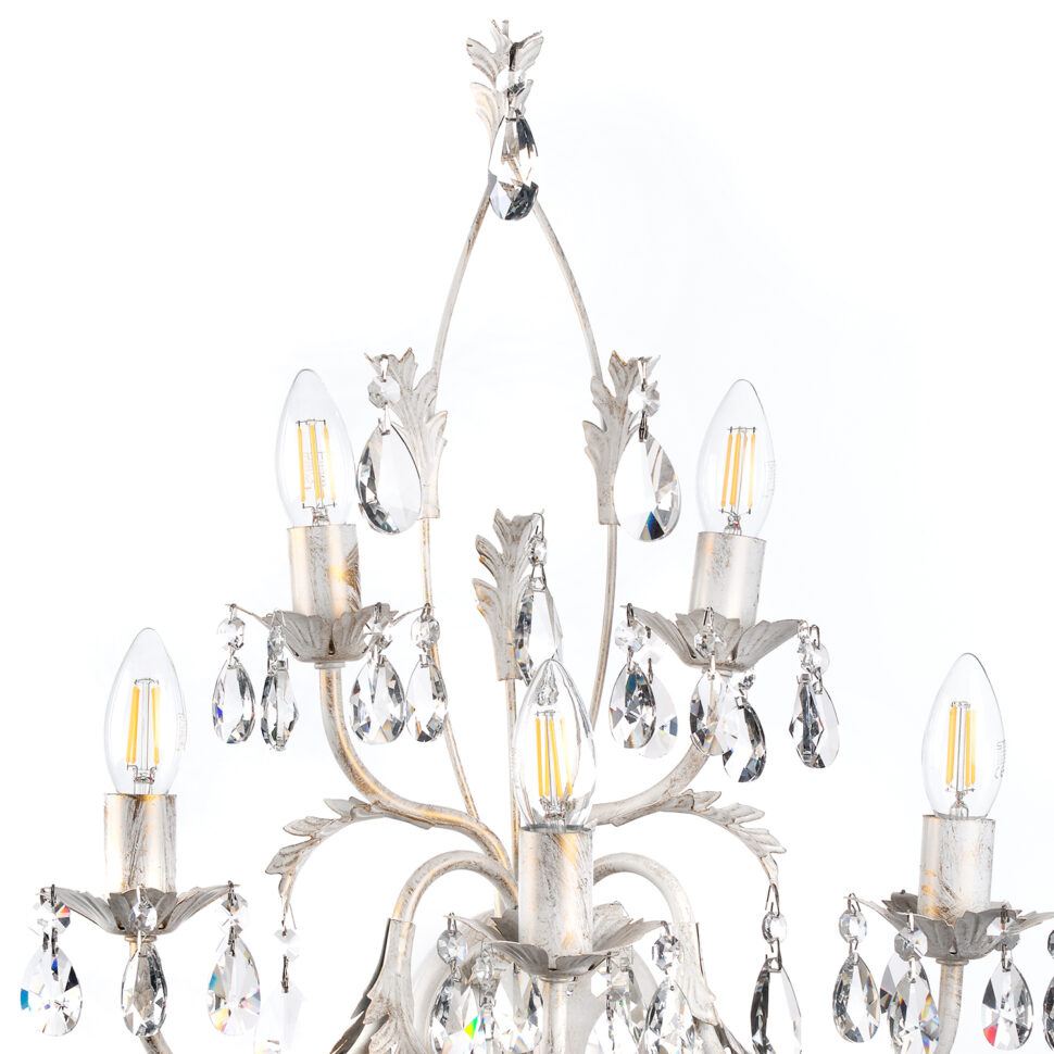 Trattasi della lampada da parete più grande della famiglia delle applique della collezione Teresa. Essa presenta infatti 5 punti luce, tutti privi di paralume, in linea con lo stile della collezione stessa. Il design è armonioso, arricchito di particolari nella struttura, tra cui dei pendenti luminosi che creano dei bellissimi giochi di luce. La struttura è in ferro lavorato a mano, color avorio con qualche gentile spennellata dorata che le conferisce un effetto anticato.