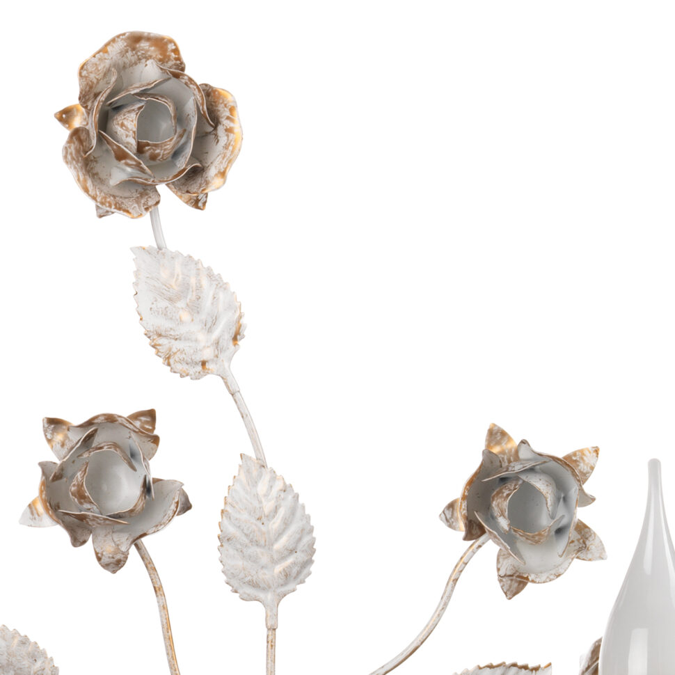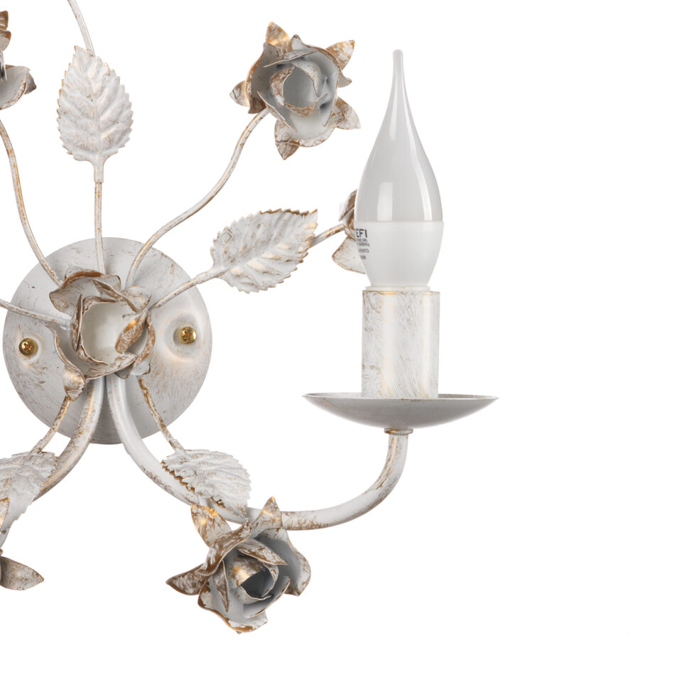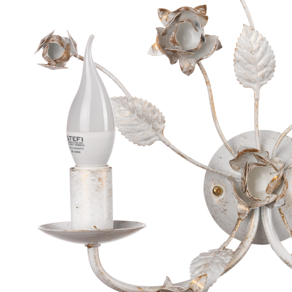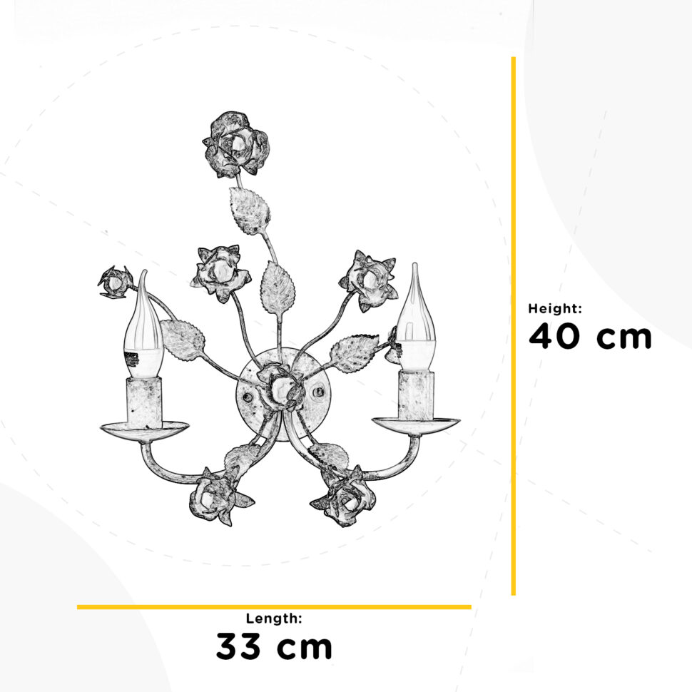L’applique Carolina è una soluzione luminosa da parete che racchiude il meglio dello stile floreale artigianale. I due bracci curvi, arricchiti da rose e foglie in ferro battuto, si aprono per accogliere lampadine a candela che diffondono una luce suggestiva. La finitura bianca con tocchi dorati dona eleganza e luminosità, rendendo questa applique perfetta per corridoi, salotti e camere da letto dallo stile romantico e classico.. L’apparecchio per interni è idoneo per l’installazione a parete. Abbinalo con lampada grande, lampadario e lumetto della stessa linea.