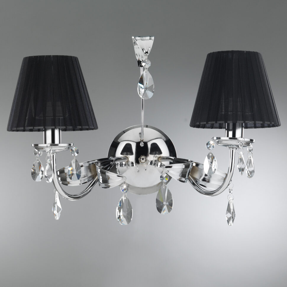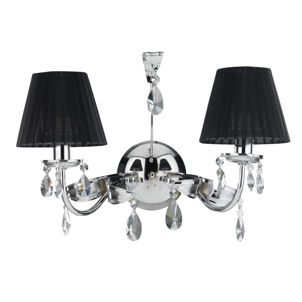 Versione più decisa e sofisticata, l’applique Jacqueline con paralumi neri unisce il metallo cromato lucido a tessuti in organza scura. I cristalli K9 pendenti spezzano la profondità del nero con bagliori luminosi, dando vita a giochi di luce affascinanti. Ideale per chi cerca un punto luce elegante ma con un carattere forte, capace di valorizzare sia spazi moderni sia interni dal gusto glamour.