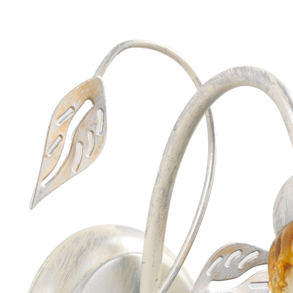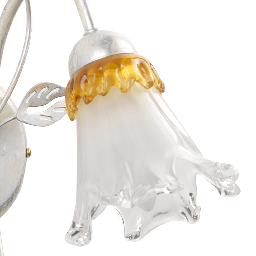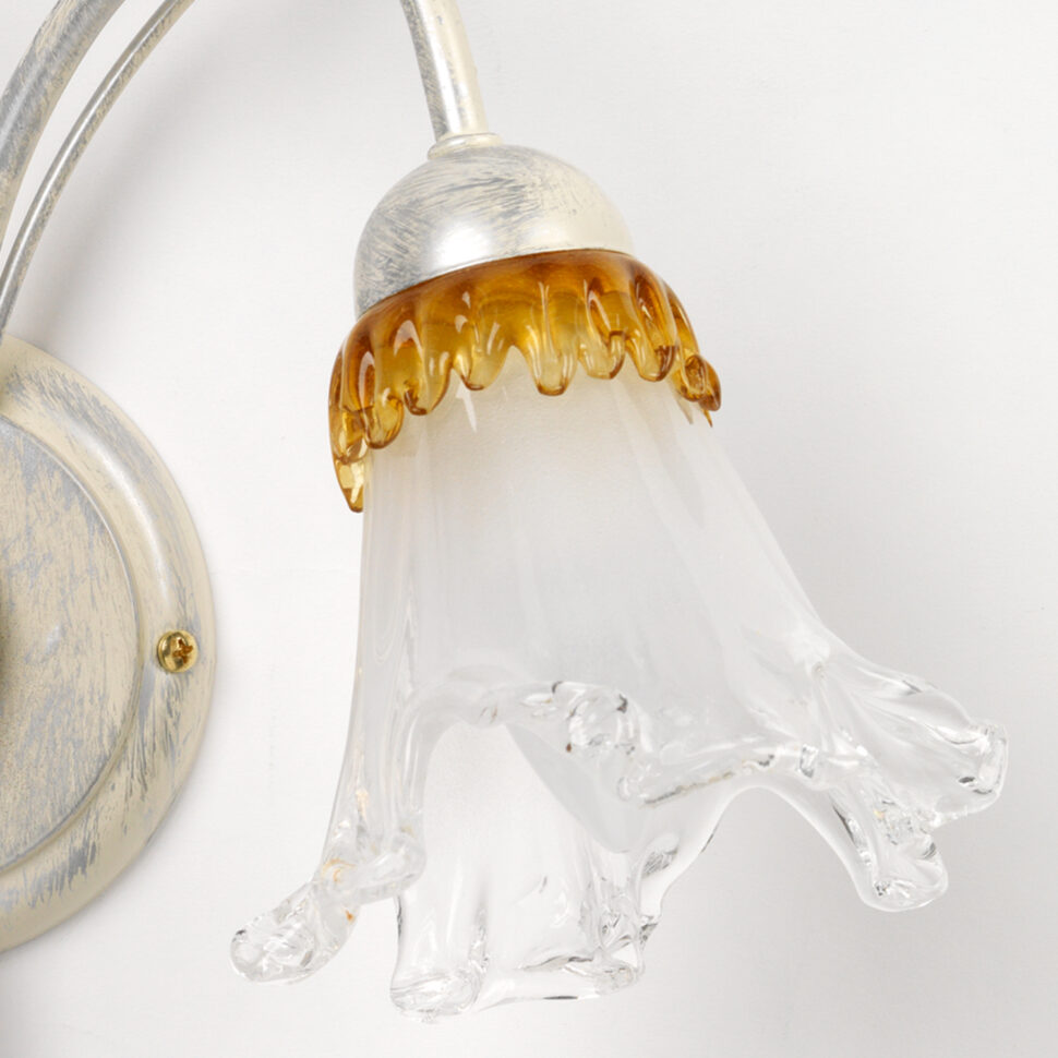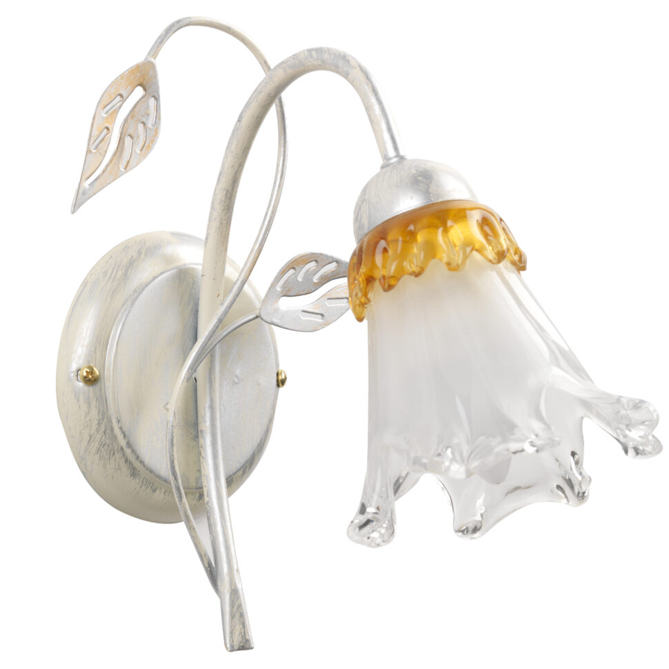 Lampada da parete a una luce con paralume rivolto verso il basso. Struttura bianca spennellata argento e oro, a riprendere l'ambra delle calle in vetro. Perfetta per corridoi e camere da letto.