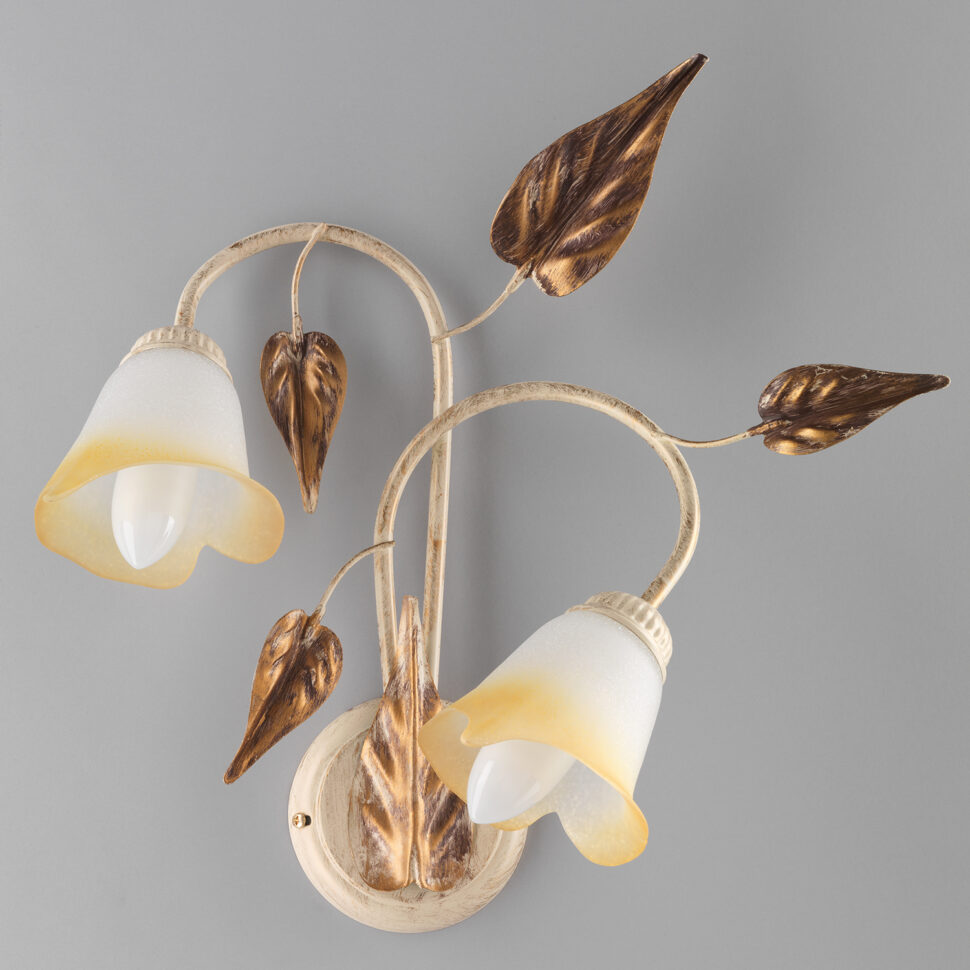 Lampada da parete a 2 luci con paralumi rivolti verso il basso, a forma di calle bianche sfumate ambra con interno sabbiato. Struttura in avorio spennellata oro lavorata a mano in Italia. Ad arricchire le forme essenziali, vi sono le foglie dorate. Ideale per qualsiasi zona della vostra casa, perfetta per i corridoi.