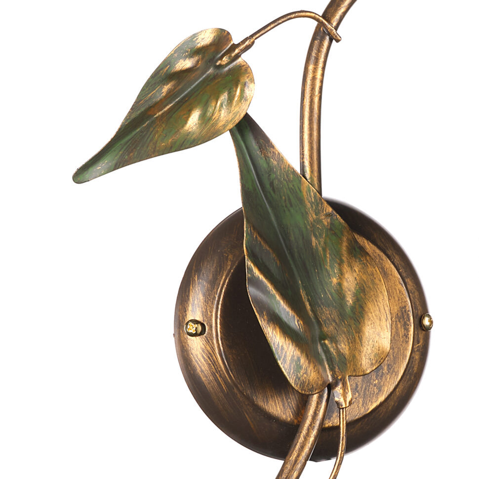 Lampada da parete a una luce con paralume rivolto verso il basso, a forma di calla bianco sfumato ambra con interno sabbiato. Struttura in bronzo spennellata oro lavorata a mano in Italia. Ad arricchire le forme essenziali, vi sono le foglie verdi. Ideale per qualsiasi zona della vostra casa, perfetta per i corridoi. Attacco E14, altezza 35 cm, lunghezza 30 cm. La musa ispiratrice della collezione Miranda è la natura. Le decorazioni sono foglie e fiori, le foglie sono verdi spennellate oro e di dimensioni differenti. I paralumi ricordano uno dei fiori più belli e sensuali, la calla. I paralumi sono in vetro bianco sfumato color ambra con interno sabbiato. Le lampade Miranda si sposano bene negli ambienti classici e rustici, dove cioè si privilegiano arredi che parlano di antiche usanze e tradizioni, dove il tempo sembra essersi fermato e sospeso.
