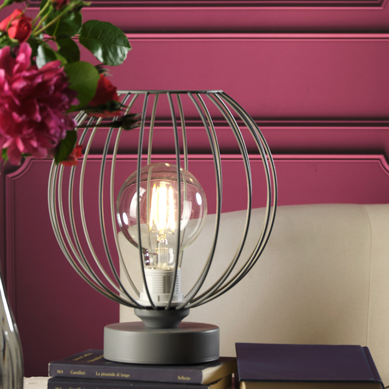 Lumetto Melone grigio dal design moderno e raffinato, realizzato in metallo verniciato con finitura grigia opaca. La struttura a gabbia dalla forma sferica avvolge la lampadina a vista, creando un effetto luminoso decorativo e contemporaneo. Il suo stile essenziale e leggero si adatta facilmente ad ambienti moderni, industrial o minimal chic, aggiungendo un tocco di eleganza discreta e originale.