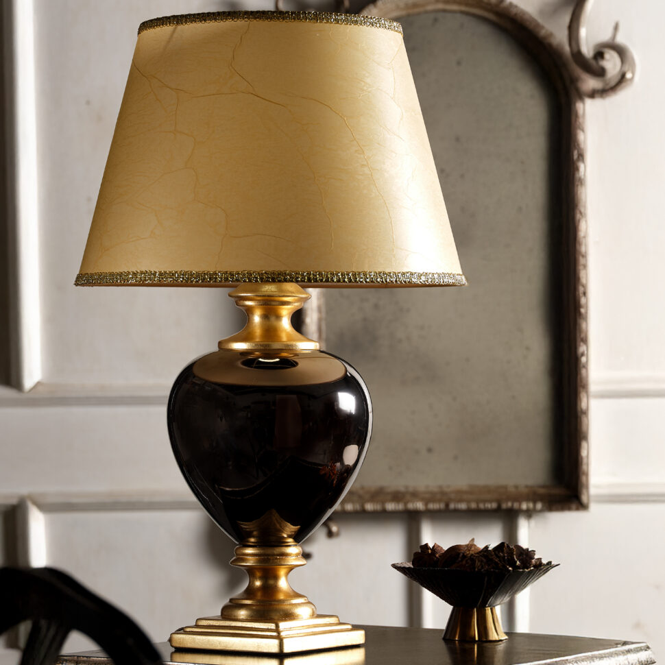 Le lampade di questa collezione sono dei modelli di pura eleganza, un’eleganza classica, con tratti vintage e dal gusto un po' retrò. Il colore che le impreziosisce maggiormente è l'oro, che si rintraccia sia in alcuni dettagli della struttura, in ceramica, sia nel paralume. Lo specifichiamo in quanto abbiamo realizzato due varianti di colore. Abbiamo una linea Mozart platino ed una variante Mozart avorio. Il platino e l'avorio rappresentano quindi la tonalità di base delle strutture in ceramica, che sono rifinite in oro e si sposano alla perfezione con i paralumi. Essi sono molto fini, sono in pergamena color oro arricchiti da un effetto crepato e rifiniti con dei bordi ricamati in tessuto dorato, che diventa dorato e nero nella variante con base in ceramica platino.