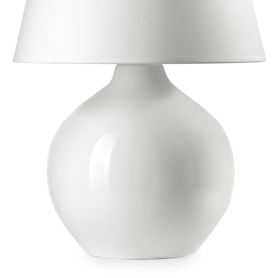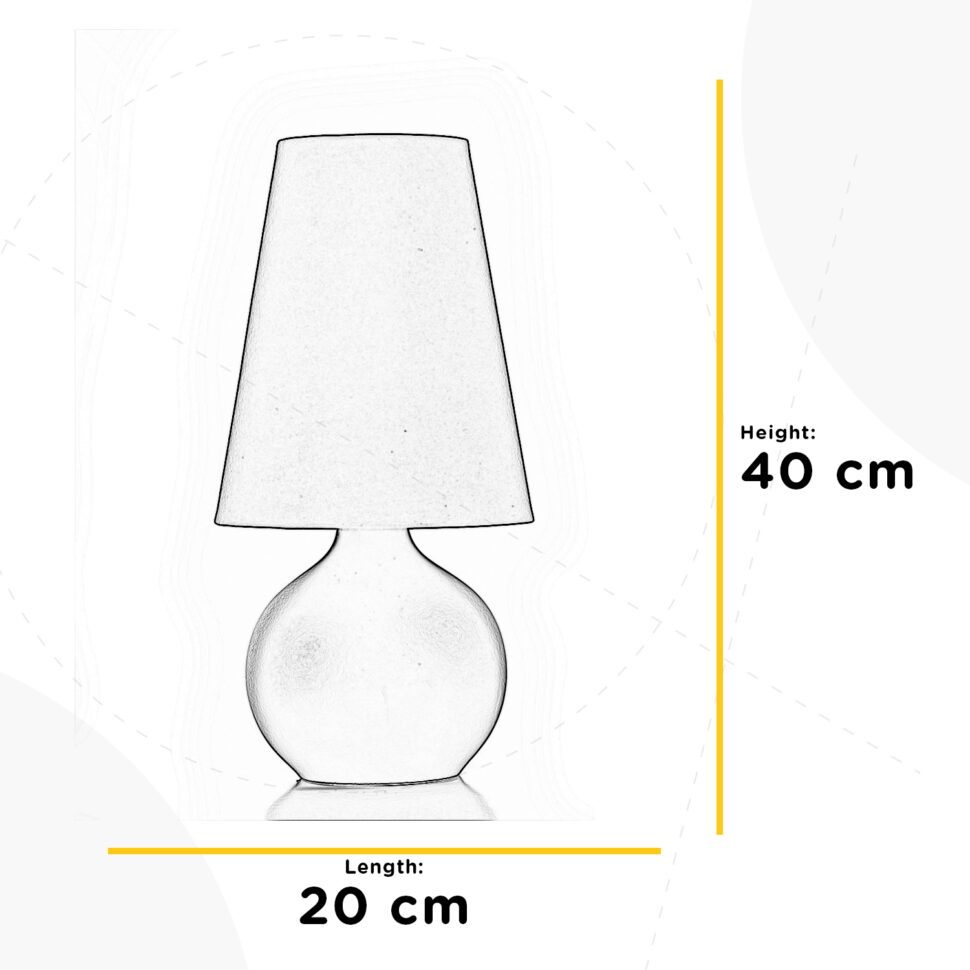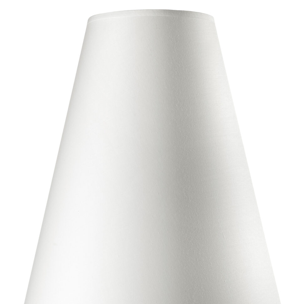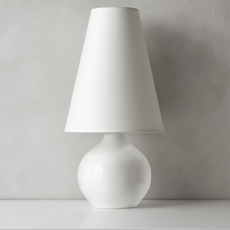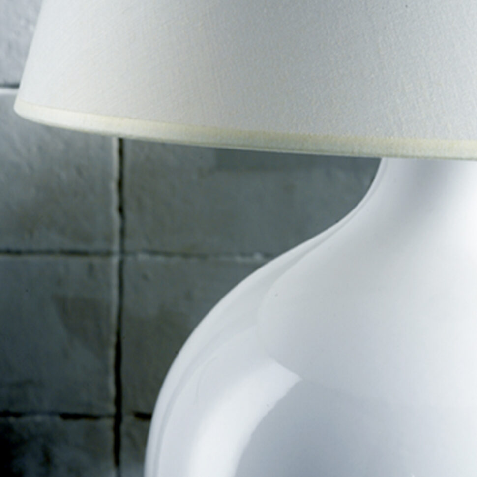 Lampada da tavolo grande con base in ceramica color bianco e paralume pinocchio in stoffa bianca.
