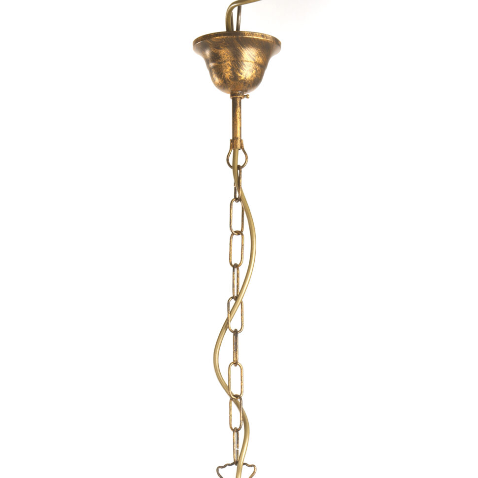 Lampadario a 3 luci color bronzo spennellato oro con attacco E14. La struttura in ferro presenta delle decorazioni di foglie che rendono il prodotto elegante e classico. Ideale sia per la camera ma anche per il soggiorno / cucina. Il diametro è 65 cm ed è alto 82 cm. L' altezza della catena è regolabile.