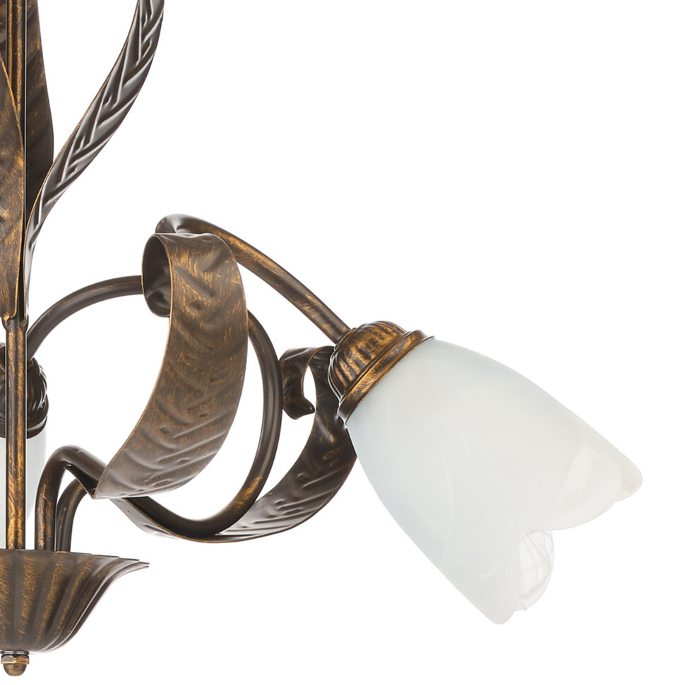 Lampada da soffitto a 3 luci con foglie decorative. Perfetta per la zona giorno, ideale anche alla zona notte. Sospensione con attacchi E14, altezza 100 cm, diametro 50 cm.