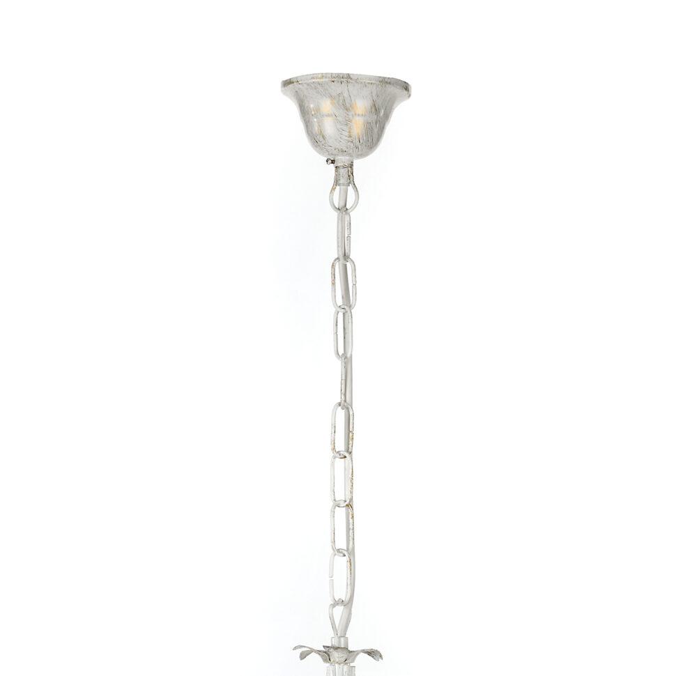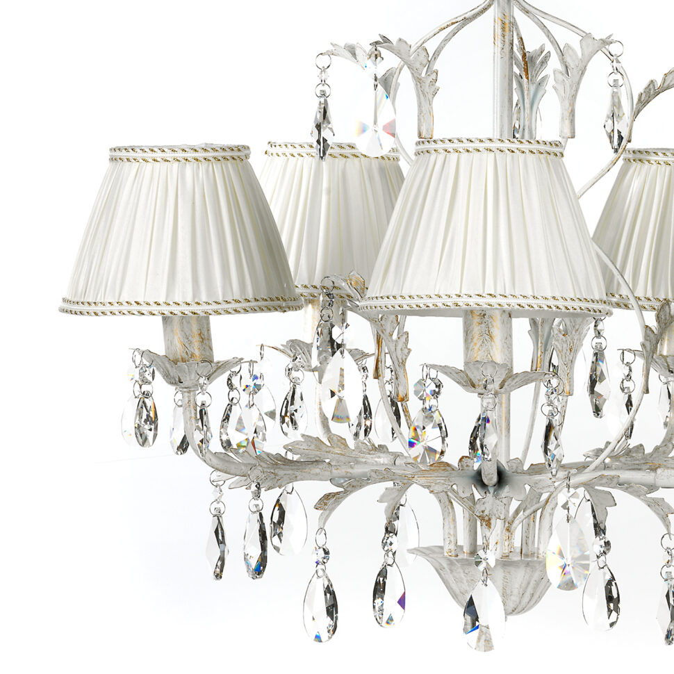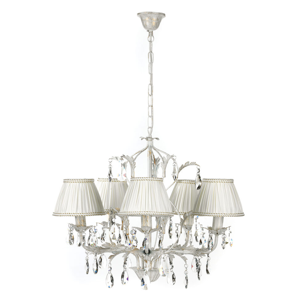 Lampada da soffitto a 5 luci. Struttura in metallo bianco effetto anticato con paralumi in stoffa bianca plissé. Ideale per la zona giorno. Altezza 105 cm, diametro 60 cm.