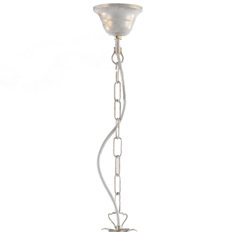 Lampada da soffitto a 5 luci. Struttura color avorio spennellata oro con foglie decorative. Ideale per il soggiorno e la camera da letto.