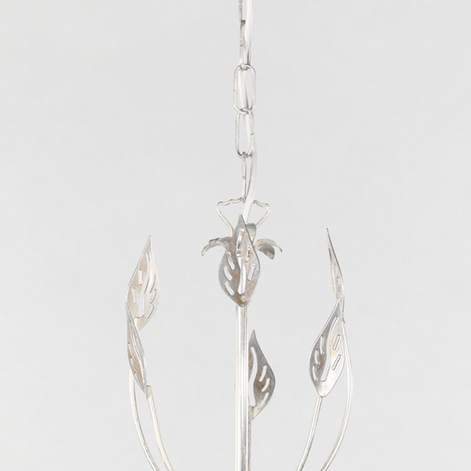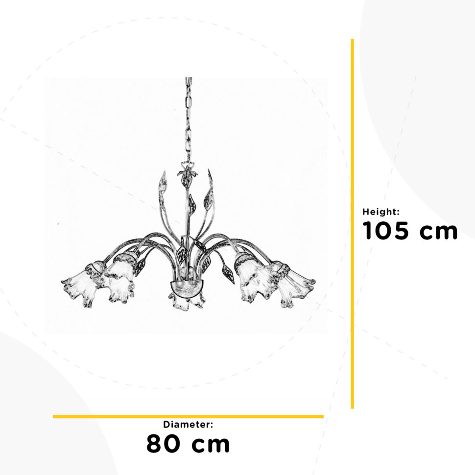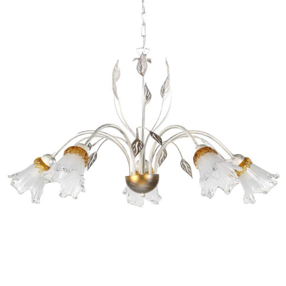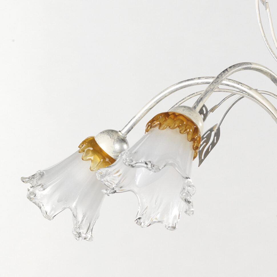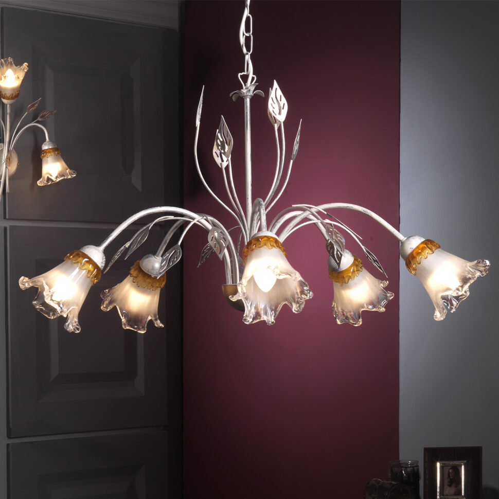 Lampada da soffitto a 5 luci. Struttura bianca spennellata argento e oro, a riprendere l'ambra delle calle in vetro. Cablaggio e catena color bianco, coppa dorata spennellata argento. Perfetto per camera da letto, sala, salotto e cucina.