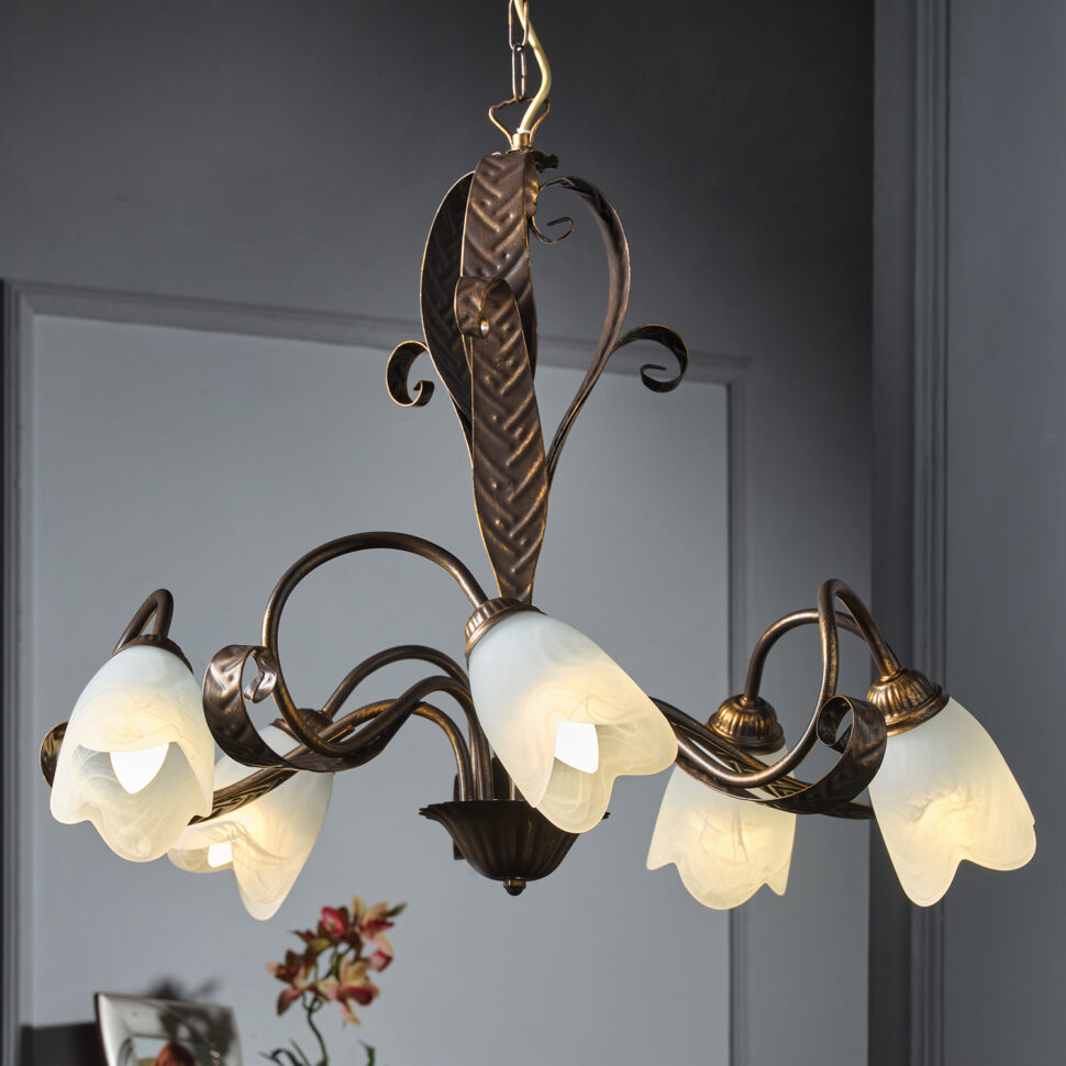 Lampada da soffitto a 5 luci con foglie decorative. Perfetta per la zona giorno, ideale anche alla zona notte. Sospensione con attacchi E14, altezza 100 cm, diametro 70 cm.