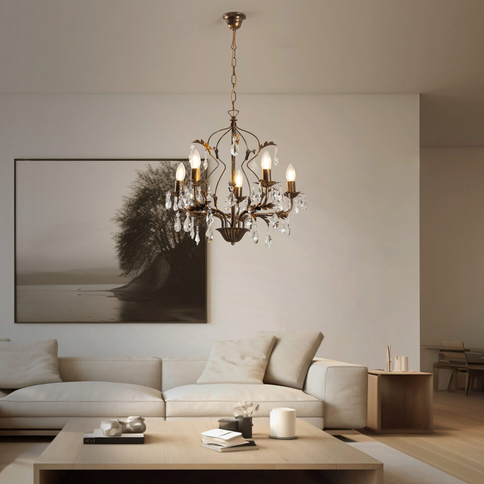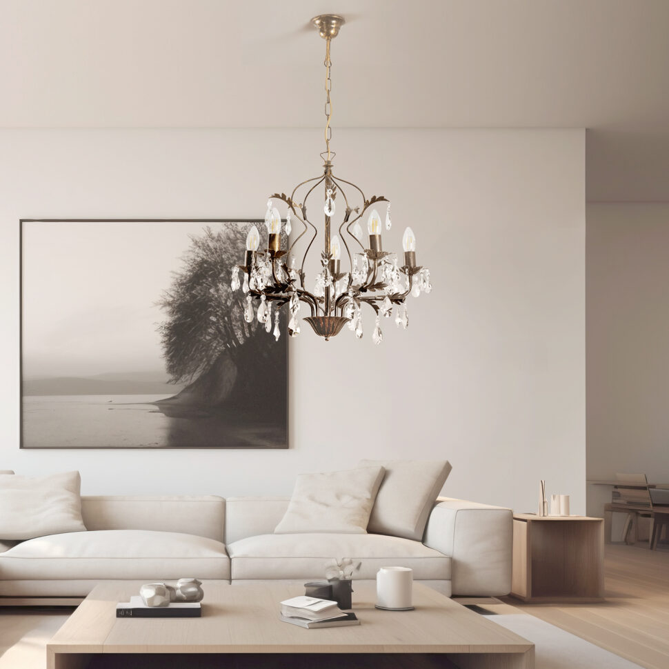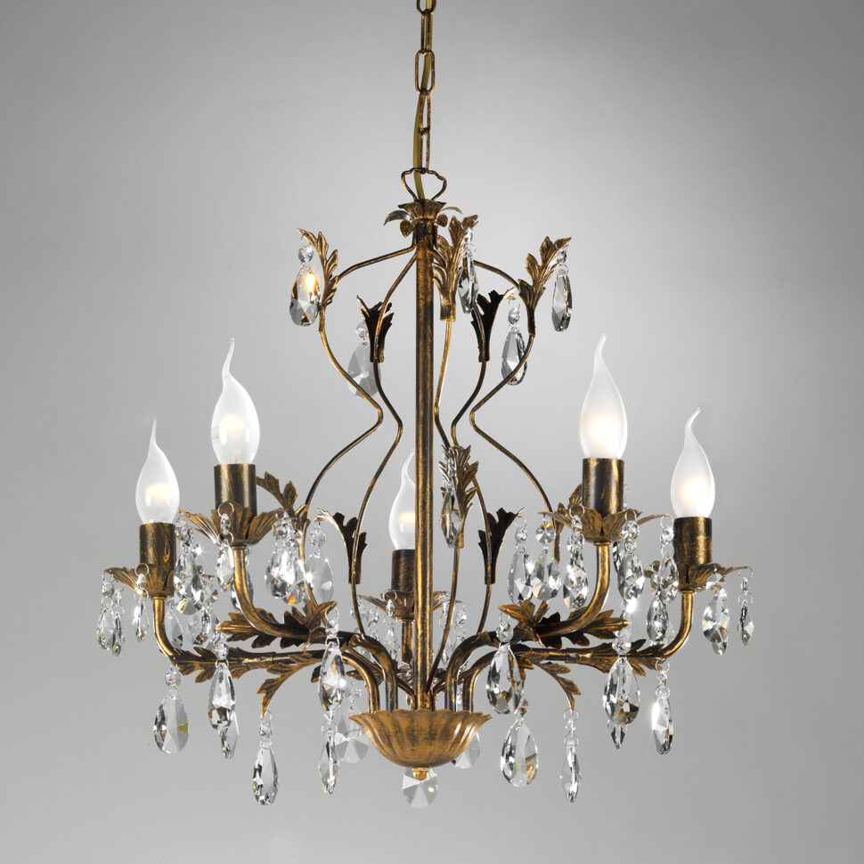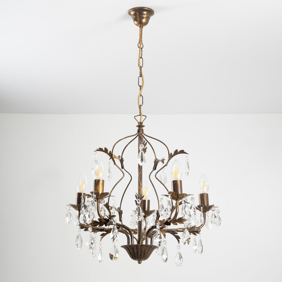 Lampada da soffitto a 5 luci. Struttura color bronzo spennellata oro con foglie decorative. Lampadine non incluse. Ideale per il soggiorno e la camera da letto.