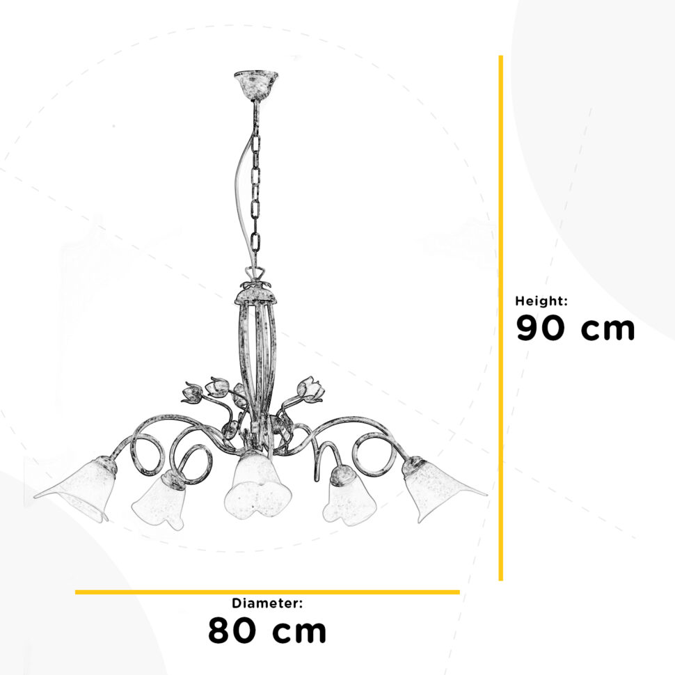 Lampadario a 5 luci con attacco E14. La struttura è di colore bianco antico spennellato oro. I decori floreali lo rendono elegante e affascinante. Perfetta sia per la zona giorno che per la zona notte. Il lampadario è largo 80 cm e alto 90 cm. L'altezza della catena è regolabile.