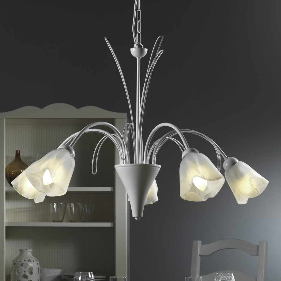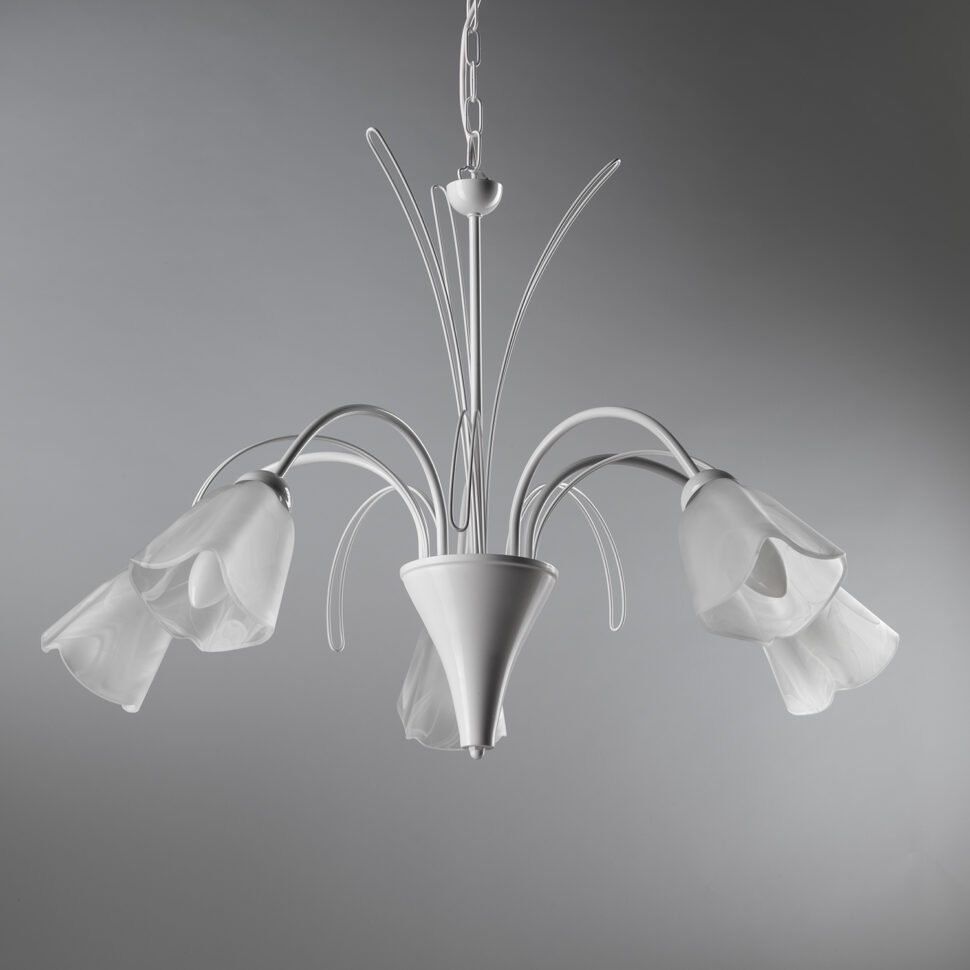 Lampada da soffitto a 5 luci. Grazie alle sue linee delicate e i suoi colori sobri, si adatta facilmente ad ogni ambiente.