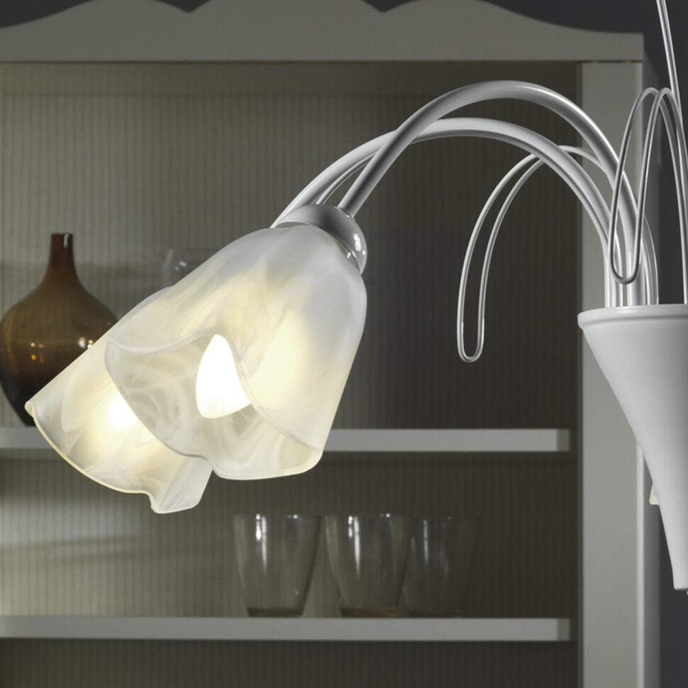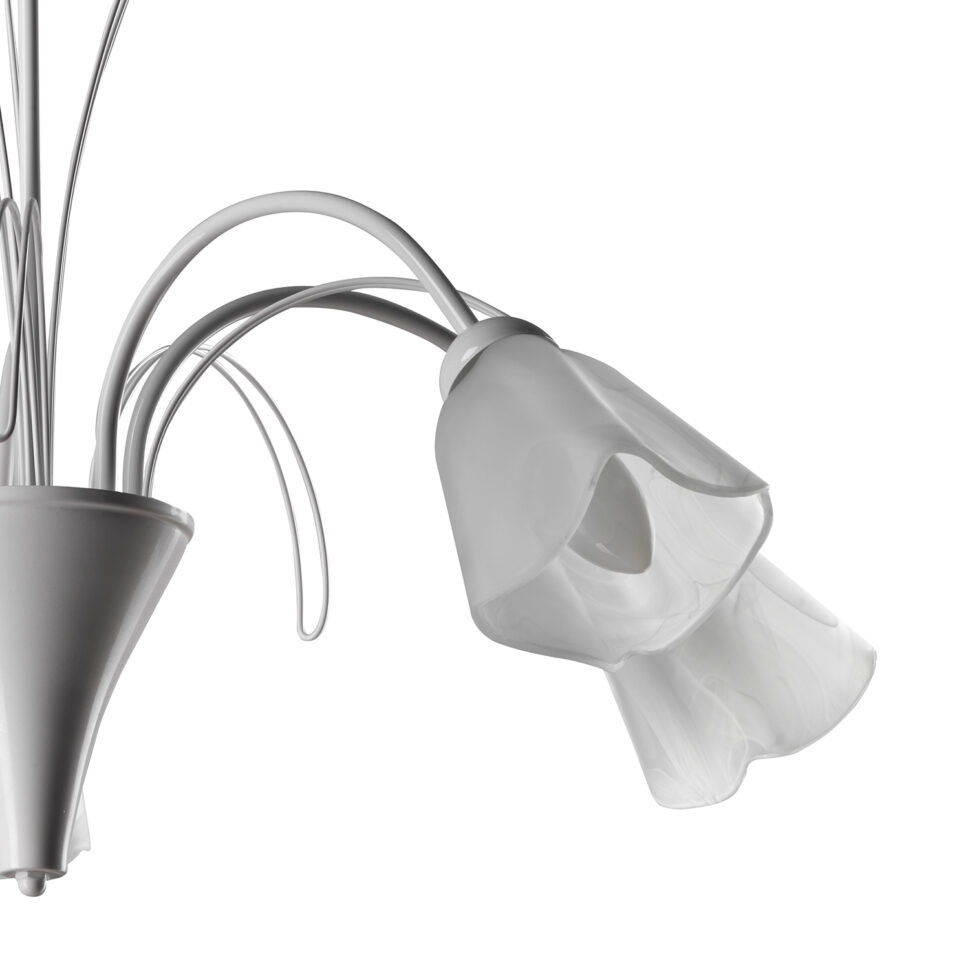 Essi sono in vetro bianco con decoro alabastro, molto fini e sofisticati. Le strutture invece hanno linee delicate e in ciascun differente modello abbiamo cercato di avvicinarci ai movimenti armoniosi e sinuosi tipici degli steli e delle foglie, cosa che puoi vedere nel dettaglio nelle singole pagine delle lampade.
