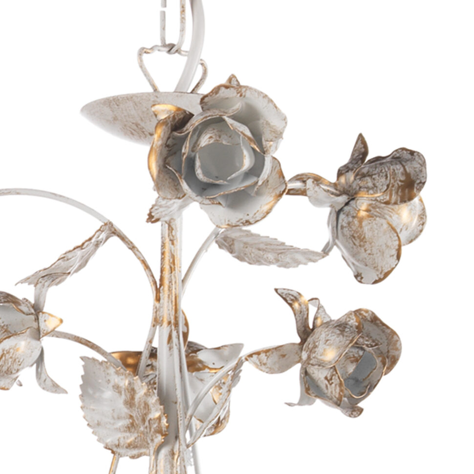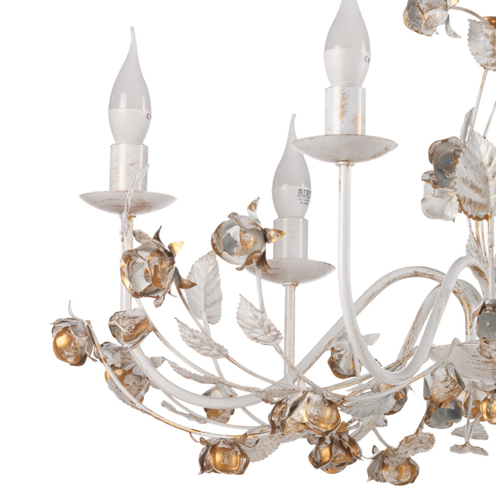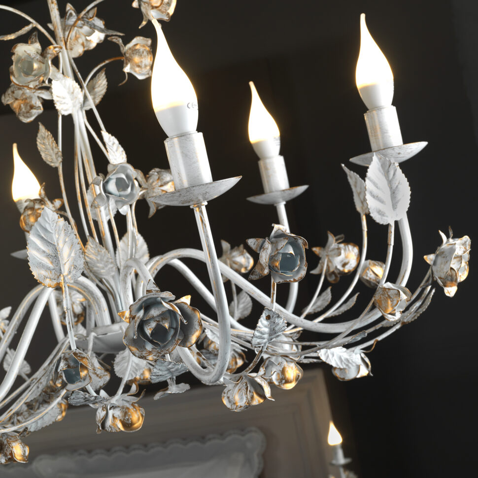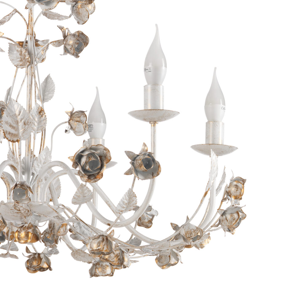 Il lampadario Carolina a 6 luci è il pezzo più scenografico della collezione. Le sue ampie linee in ferro battuto sostengono bracci decorati da un ricco intreccio di roselline e foglie, rifinite nel caratteristico bianco con pennellature oro. Le lampadine a candela completano il design, ricordando i fasti dei lampadari d’epoca ma con un tocco artigianale unico. Perfetto per ambienti importanti come sale da pranzo, soggiorni o ingressi, dona calore e raffinatezza, diventando il fulcro della stanza. L’apparecchio per interni è idoneo per l’installazione a soffitto. Abbinalo con applique,lampada grande e lumetto della stessa linea.