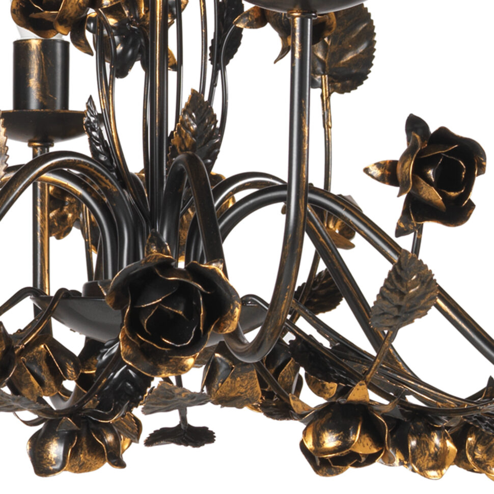 Lampada a sospensione a 6 luci con roselline e foglie decorative. Ideale per grandi saloni, si adatta anche a camere da letto spaziose.