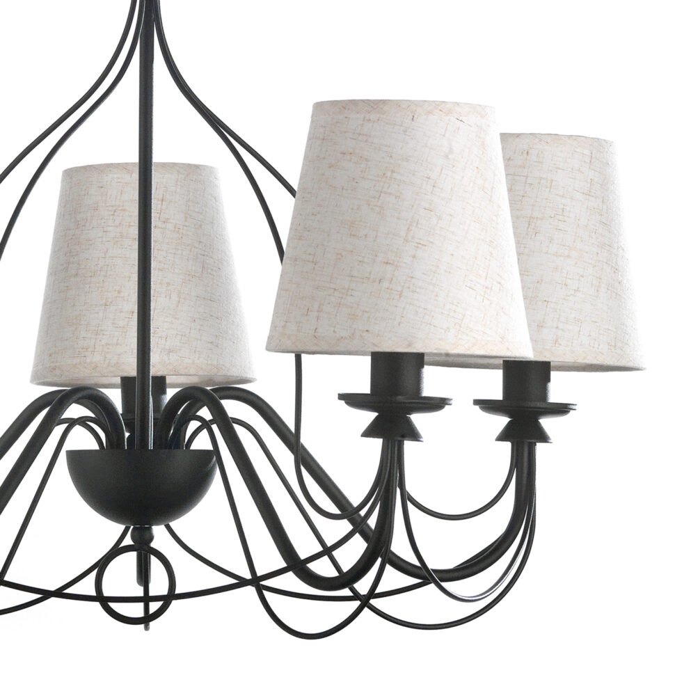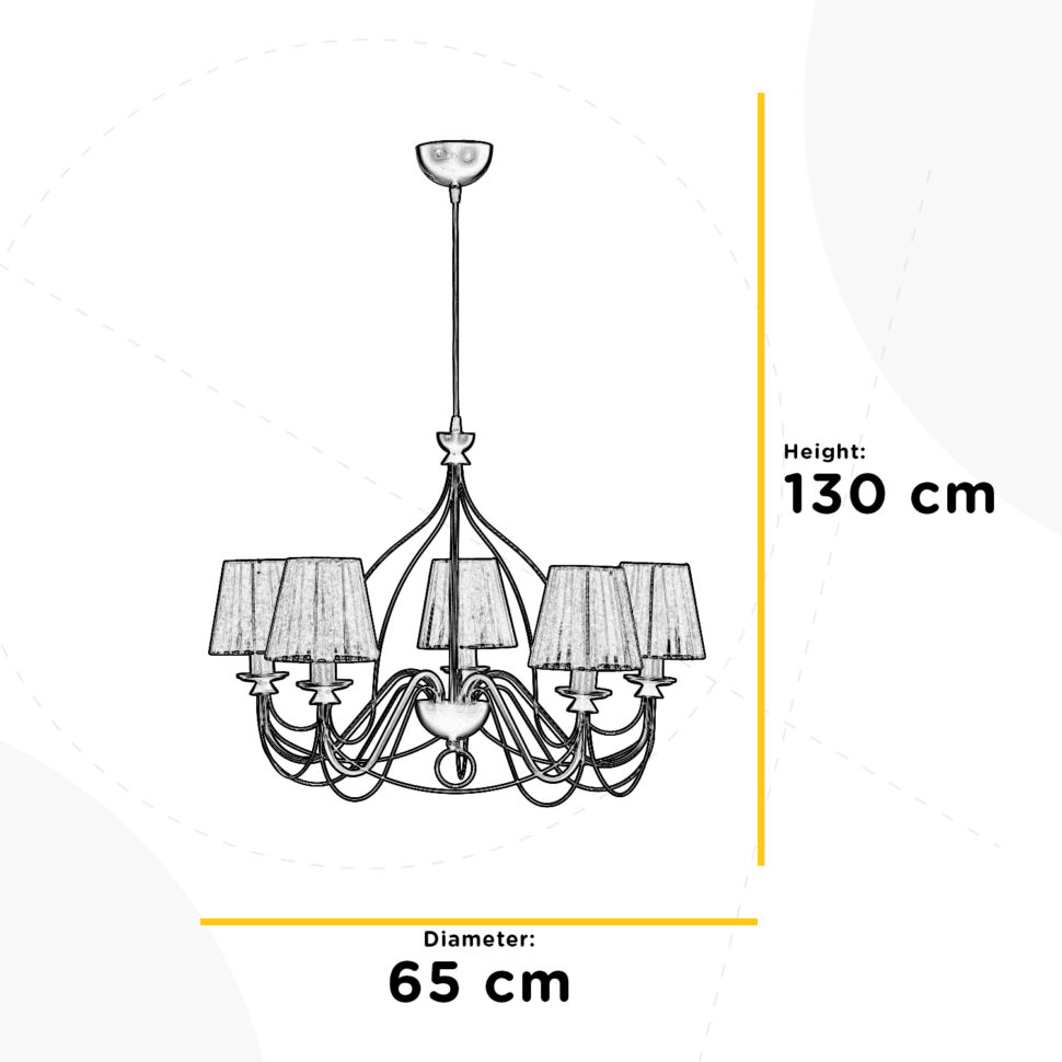 Lampadario Loris dal design elegante e intramontabile, caratterizzato da una struttura in metallo nero con bracci sinuosi e armoniosi che sostengono cinque paralumi in tessuto color sabbia. L’abbinamento del metallo scuro con i toni caldi del tessuto crea un piacevole contrasto visivo, donando all’ambiente un’atmosfera accogliente e sofisticata. Perfetto per illuminare soggiorni, sale da pranzo o camere da letto, questo lampadario unisce stile classico e moderno, adattandosi con eleganza a diverse tipologie di arredamento. Un elemento decorativo di grande impatto che arricchisce ogni spazio con luce calda e raffinata.