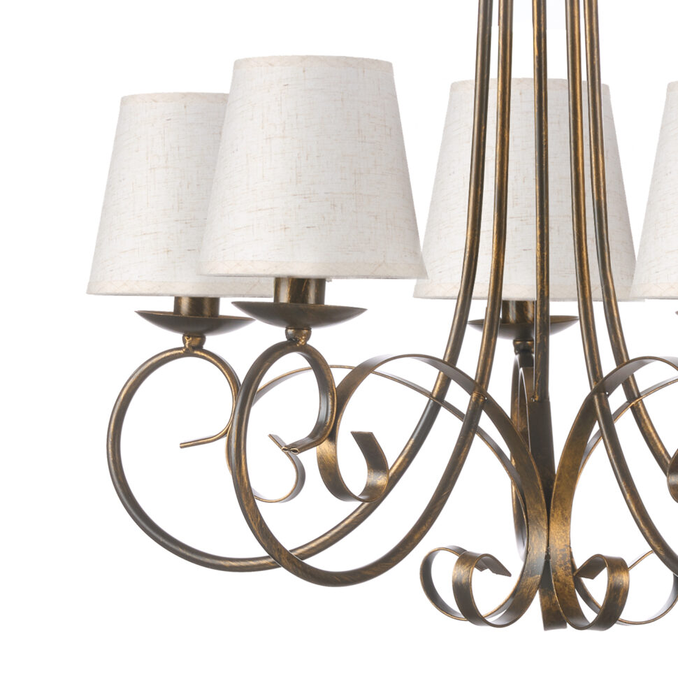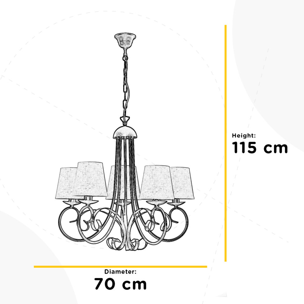 Lampada da soffitto a 5 luci con paralumi in stoffa color bianco. Perfetta per la sala, salotto e soggiorno, ma anche per la camera da letto. Sospensione con attacchi E14, altezza 115 cm, diametro 70 cm.