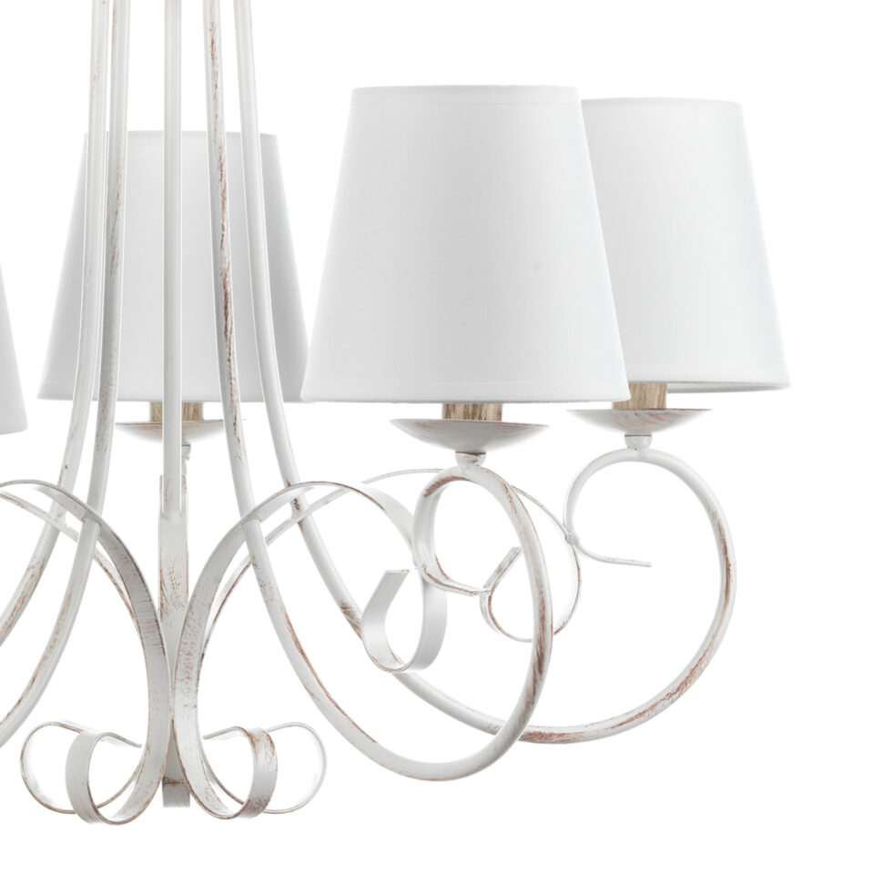 Lampada da soffitto a 5 luci con paralumi in stoffa color bianco. Perfetta per la sala, salotto e soggiorno, ma anche per la camera da letto. Sospensione con attacchi E14, altezza 115 cm, diametro 70 cm.
