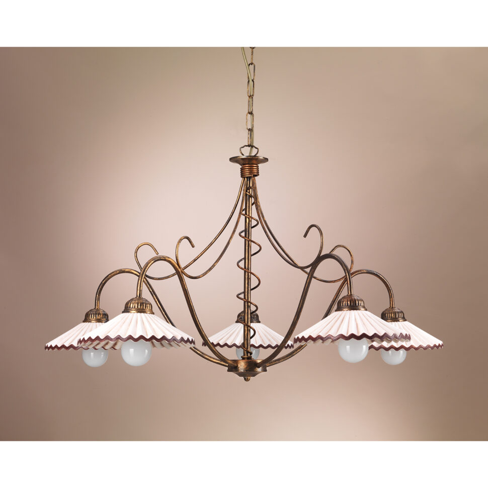 Lampada da soffitto a 5 luci con paralumi plissé in ceramica color rosa chiaro con contorno bronzo che riprende il colore del rosone e della catena. Ideale per la cucina e zona giorno di ambienti rustici.