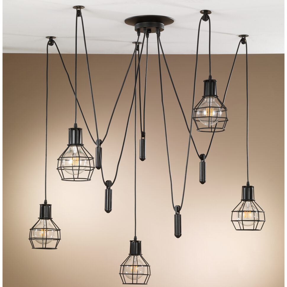 La plafoniera a 5 luci rappresenta l’anima più scenografica della collezione. Cinque diffusori a gabbia pendono da lunghi cavi che possono essere fissati al soffitto in posizioni differenti, dando vita a un gioco dinamico di linee e volumi. È una soluzione ideale per ambienti ampi, come open space o locali pubblici, dove diventa un elemento decorativo oltre che funzionale. La collezione SPIDER è caratterizzata da un design industriale moderno, con strutture in metallo nero e diffusori a gabbia che lasciano la lampadina a vista, esaltando lo stile essenziale e deciso. Ogni elemento della serie è pensato per adattarsi a diversi ambienti, sia domestici sia contract, con un tocco contemporaneo e versatile.