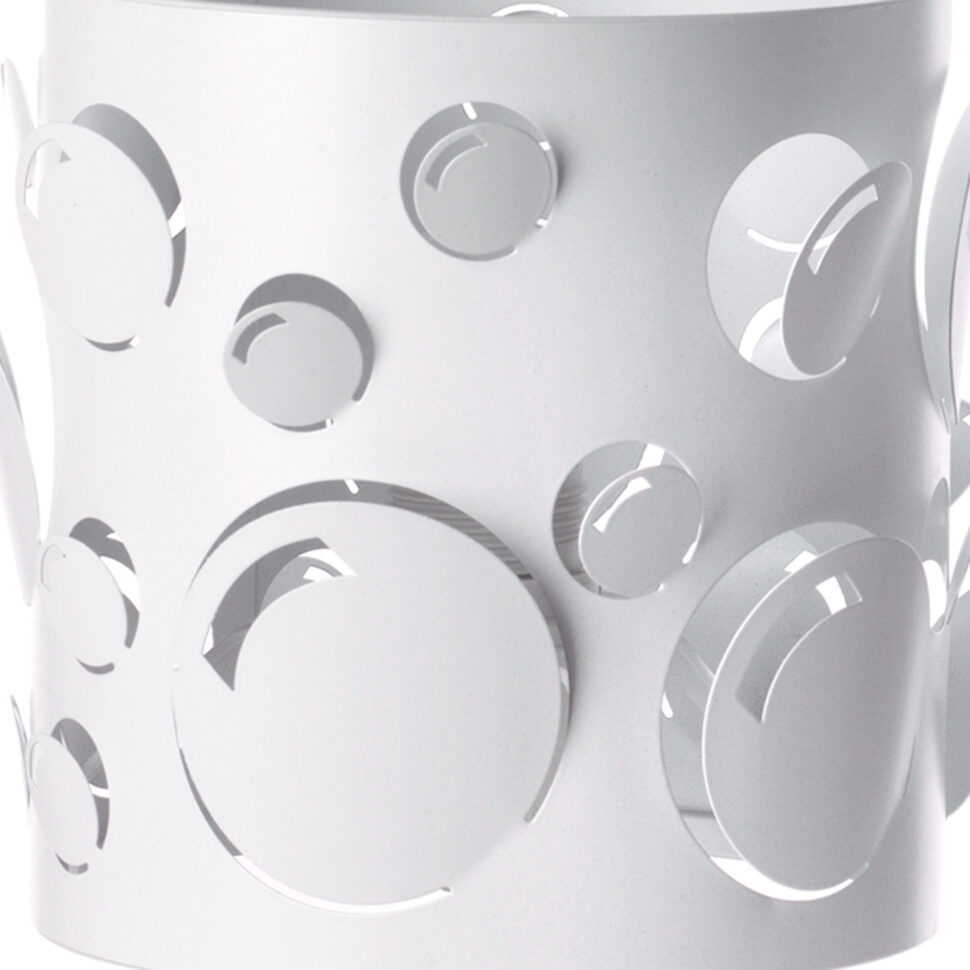 Bollicine è una collezione di lampade moderne total white. I tratti distintivi sono dati dal colore bianco e dalla particolare lavorazione dei paralumi. Essi sono in metallo ed hanno un effetto "bollicine" sulla loro superficie, effetto che si ottiene mediante taglio laser. Ciò significa che i paralumi sono costellati di tanti piccoli cerchi di misure differenti che lasciano filtrare la luce. Le piccole bolle creano sì un effetto decorativo, ma sono anche delle aperture che danno il loro contributo all'illuminazione.