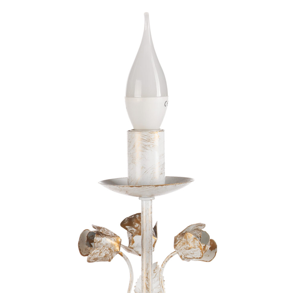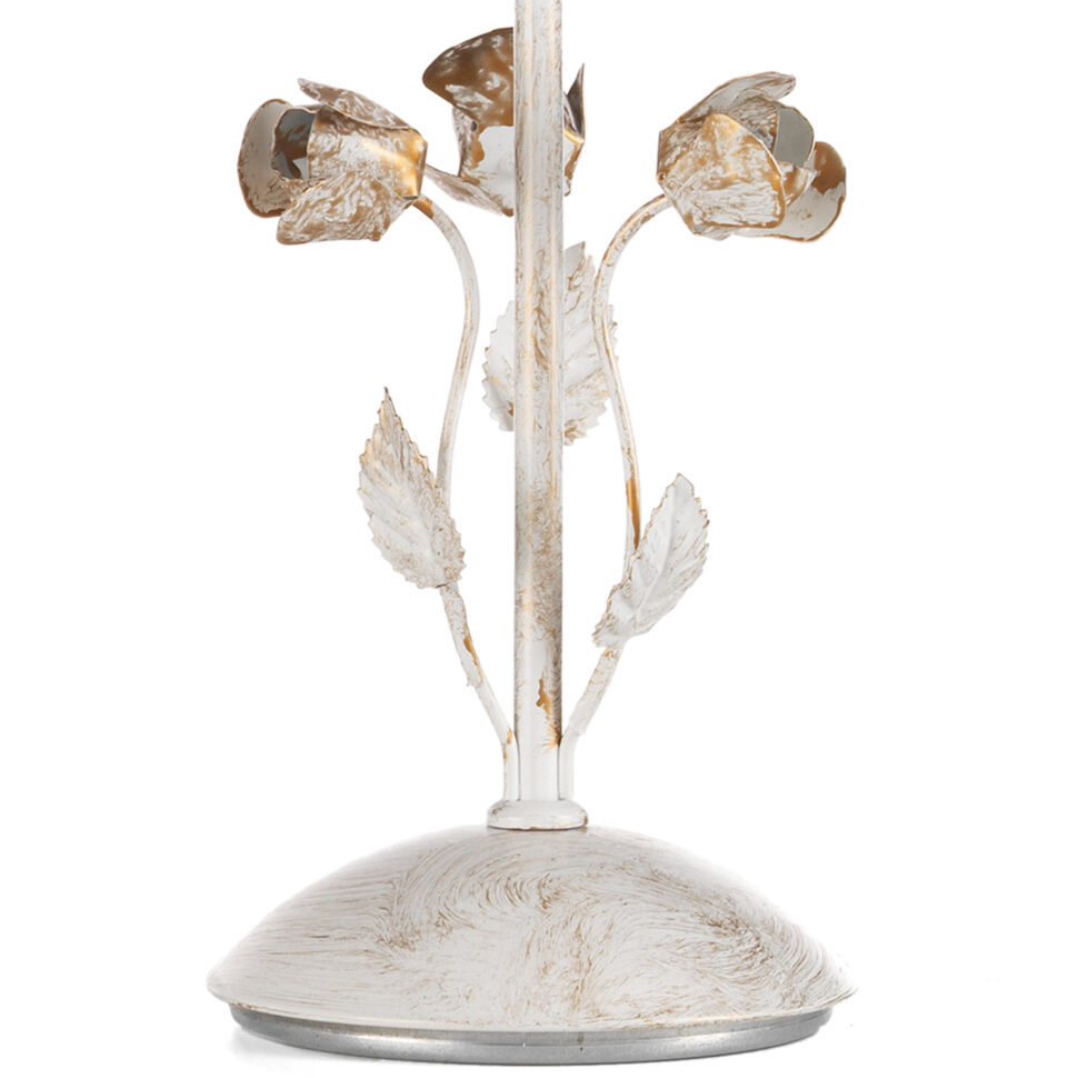 Il lumetto Carolina è una versione più compatta e versatile, ideale come punto luce su comodini o piccoli mobili. La struttura in ferro battuto, impreziosita da roselline e foglie decorative, richiama l’eleganza artigianale della collezione. La finitura bianco spennellato oro conferisce un aspetto vintage e prezioso, mentre la lampadina a candela diffonde una luce morbida e accogliente. Un dettaglio raffinato che valorizza ogni ambiente con discrezione. L’apparecchio per interni è idoneo per l’installazione a terra. Abbinalo con applique, lampada grande e lampadario della stessa linea.