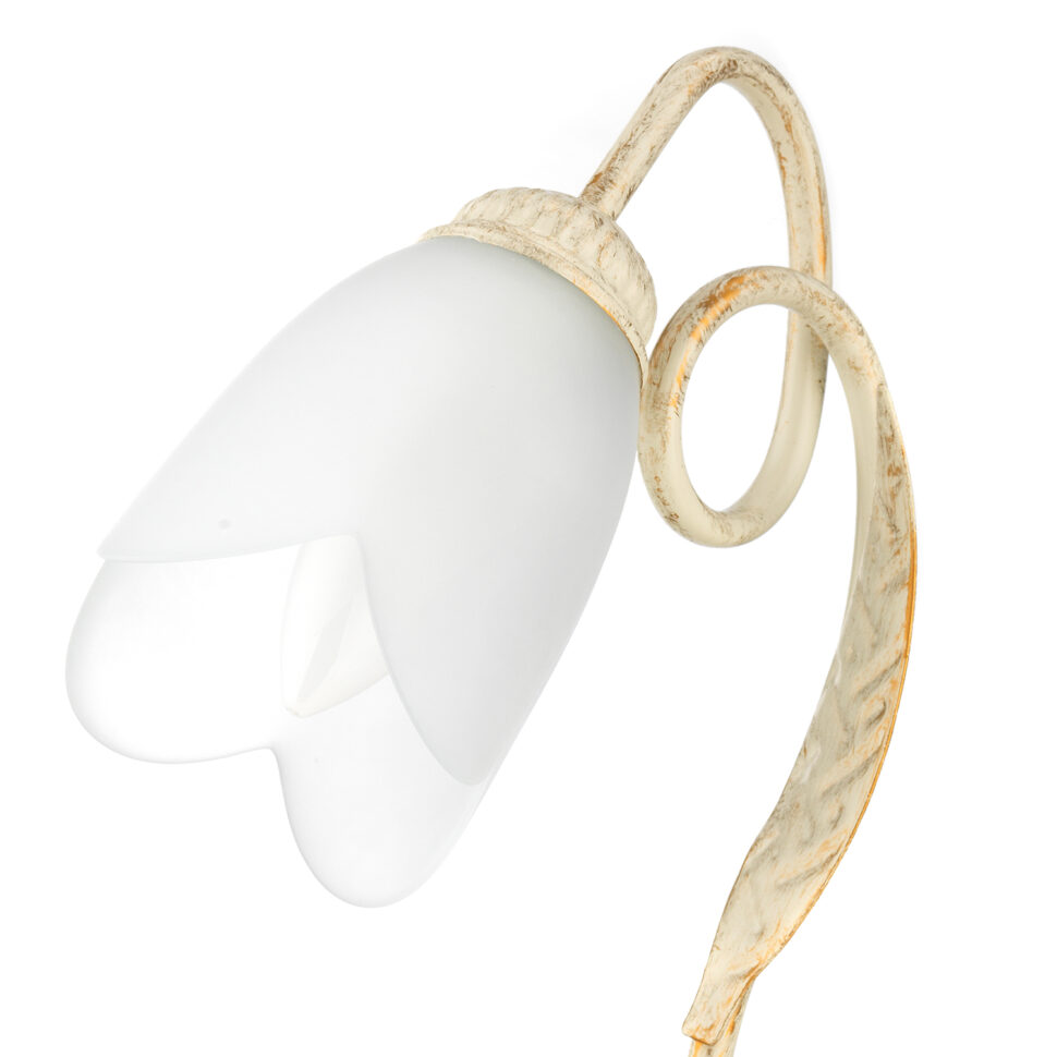 Si tratta infatti di lampade curate nei minimi dettagli, ricche di decorazioni e rimandi floreali, tanto nella struttura quanto nei paralumi. A tal proposito diciamo che ogni punto luce ha appunto un prezioso rivestimento, un paralume la cui forma ricorda un fiore, realizzato in vetro bianco satinato. In quanto alla struttura invece, essa è in ferro lavorato a mano. Ciò che la caratterizza è il colore chiaro, avorio con spennellate gentili oro, ma anche il movimento a giro che rende sinuose le sue forme.