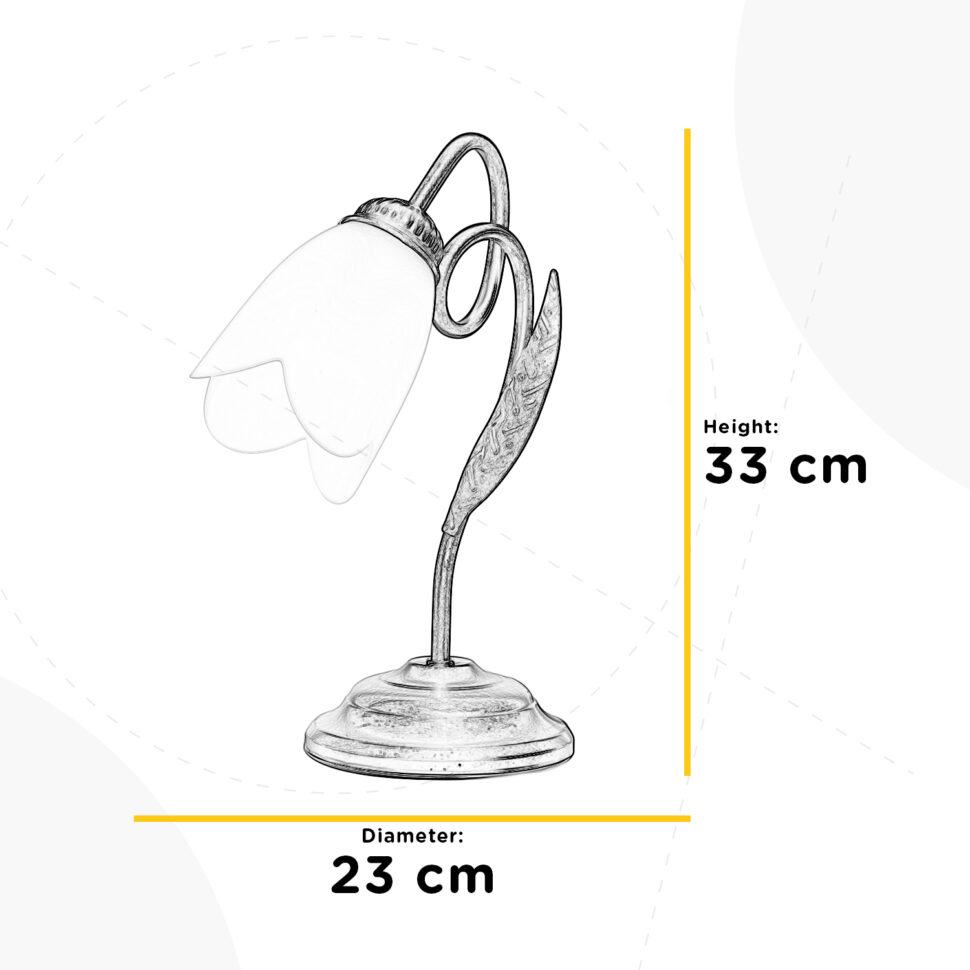 Lampada da tavolo color bronzo spennellato oro a 1 luce con attacco E14. La struttura in ferro presenta una decorazione di foglia che rende il prodotto elegante e classico. Il lumetto è largo 23 cm e alto 33 cm.