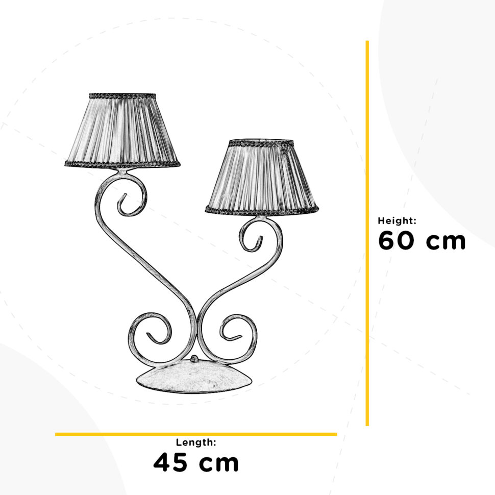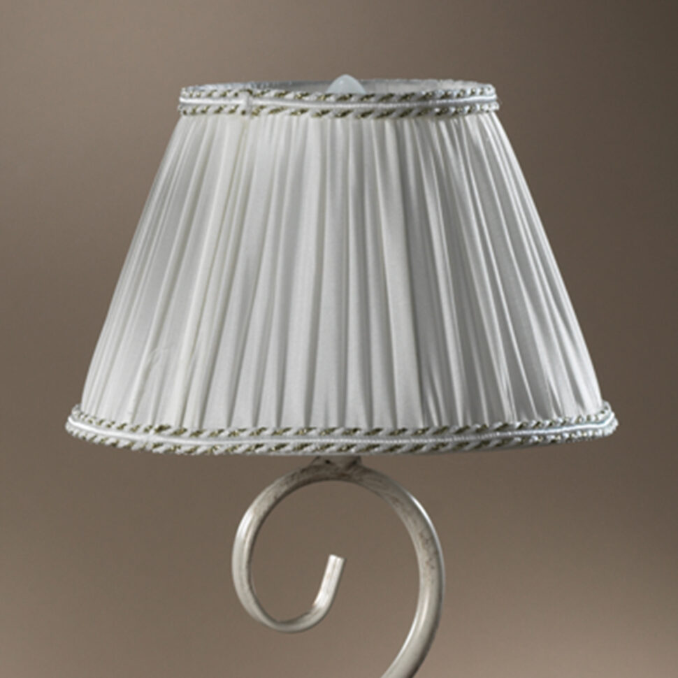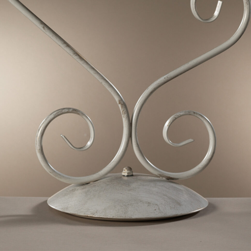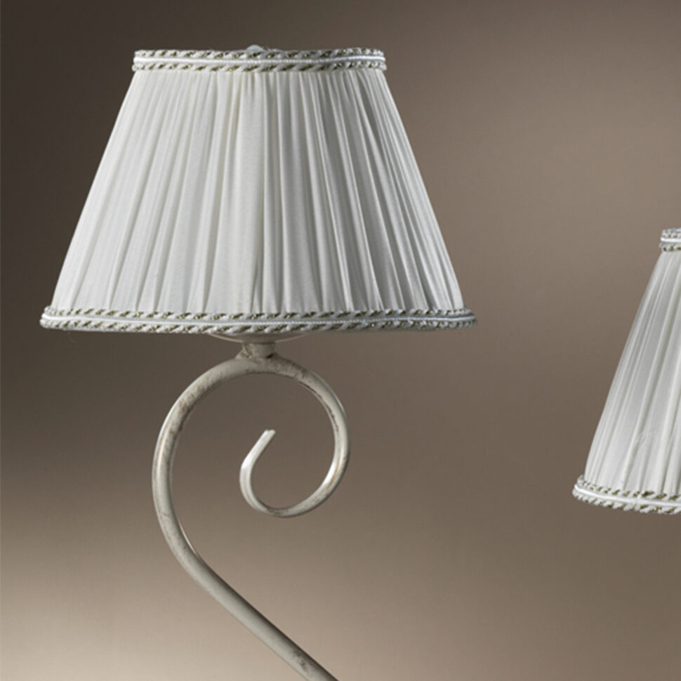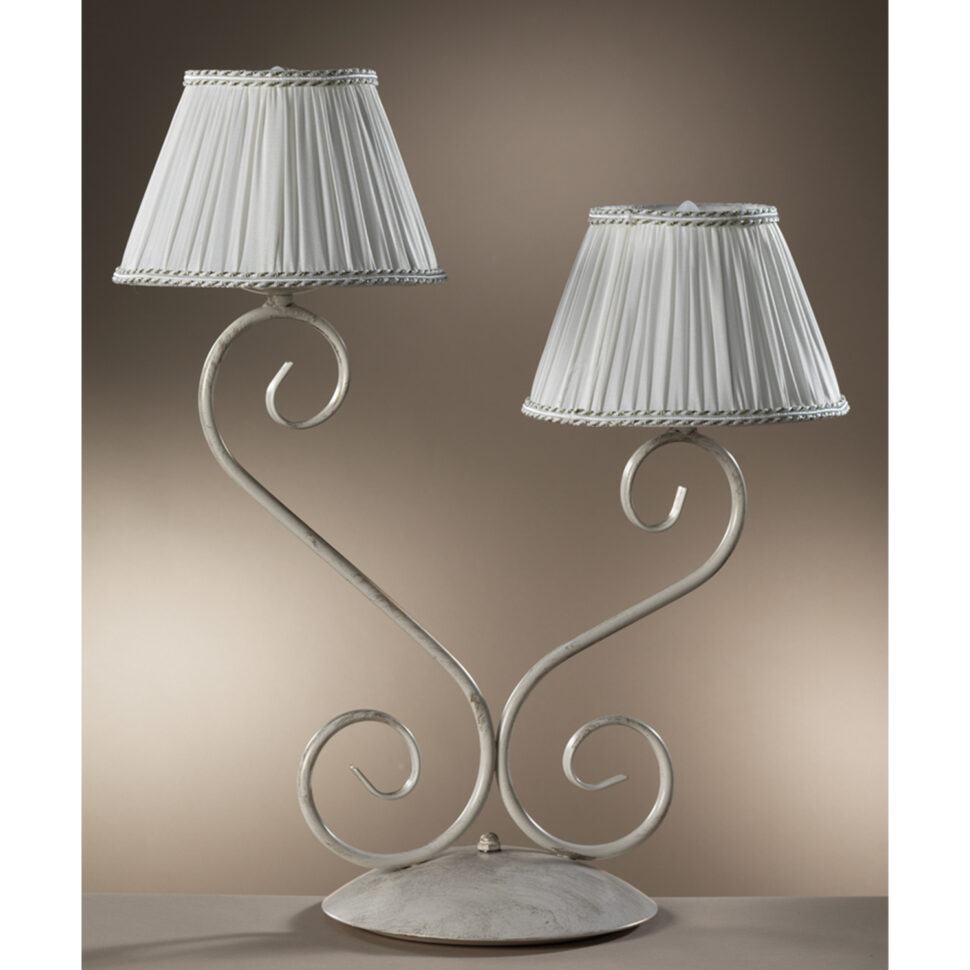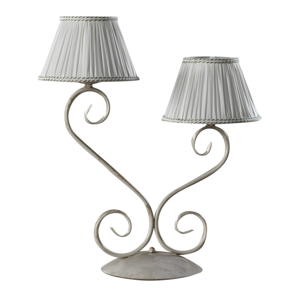 Lampada da tavolo a 2 luci con struttura in metallo color avorio chiaro. Paralumi in seta color panna. Ideale per ambienti fini ed eleganti. Ideale per la zona giorno, si adatta anche alla zona notte. Lume con attacchi E 14, altezza 45 cm, diametro 60 cm.