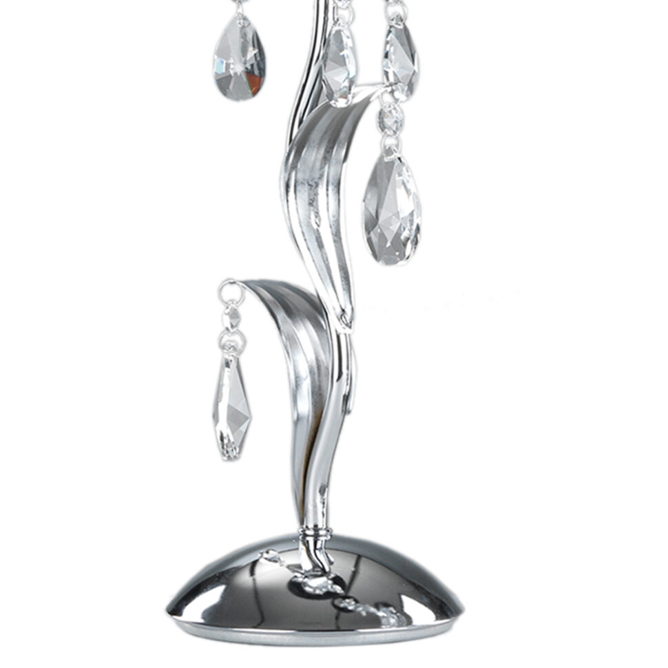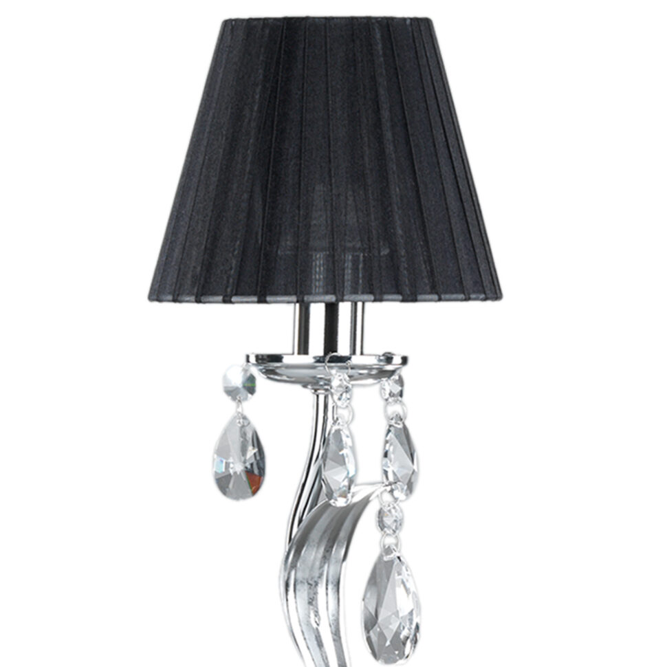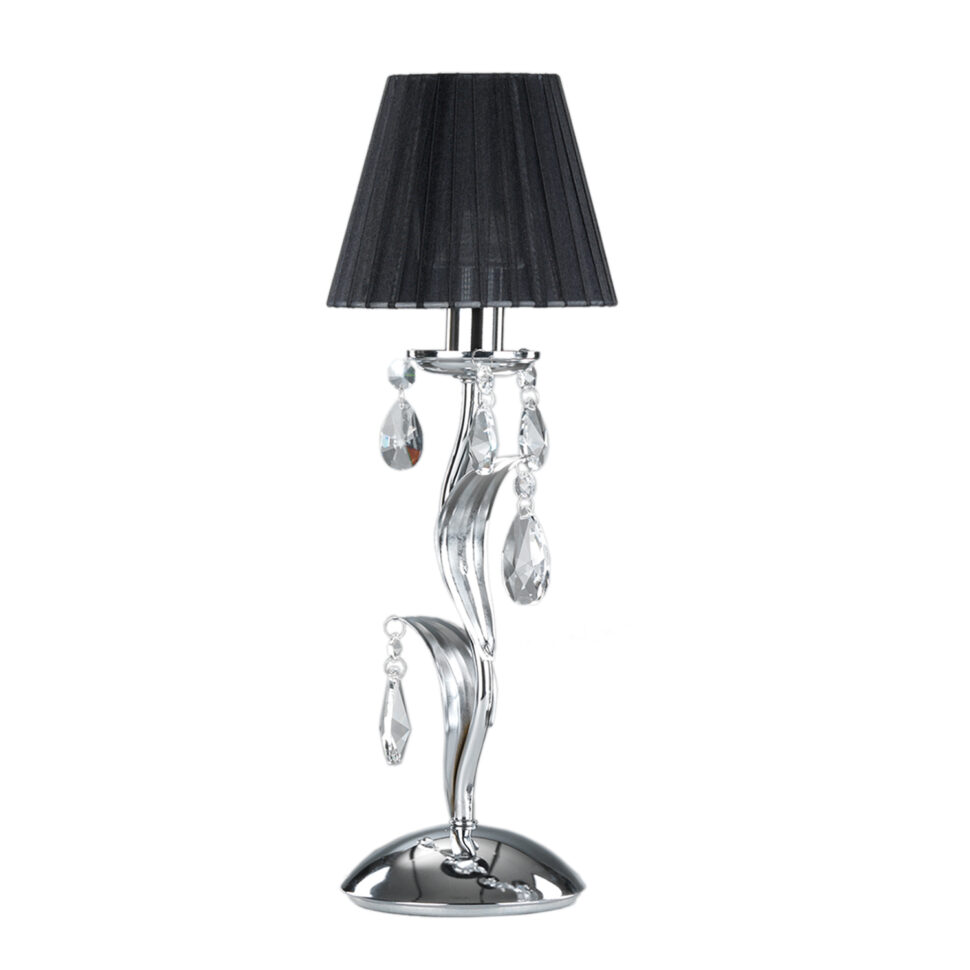 Il lume Jacqueline con paralume nero rappresenta un’eleganza più audace e scenografica. La base cromata e i cristalli trasparenti si sposano con il paralume scuro in tessuto di organza, creando un contrasto moderno e sofisticato. La luce filtrata regala un’illuminazione d’atmosfera, ideale in camere da letto, salotti o angoli lettura di forte personalità.