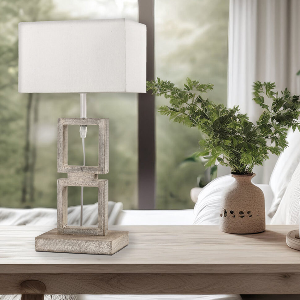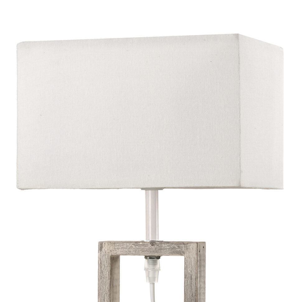 Lampada da tavolo con struttura in legno.Il telaio è formato da 2 quadrati forati uno sopra l'altro e la base è rettangolare. Il lumetto viene rifinito con un paralume a forma di parallelepipedo rettangolare color bianco sporco. Ideale sopra il comodino in camera da letto.