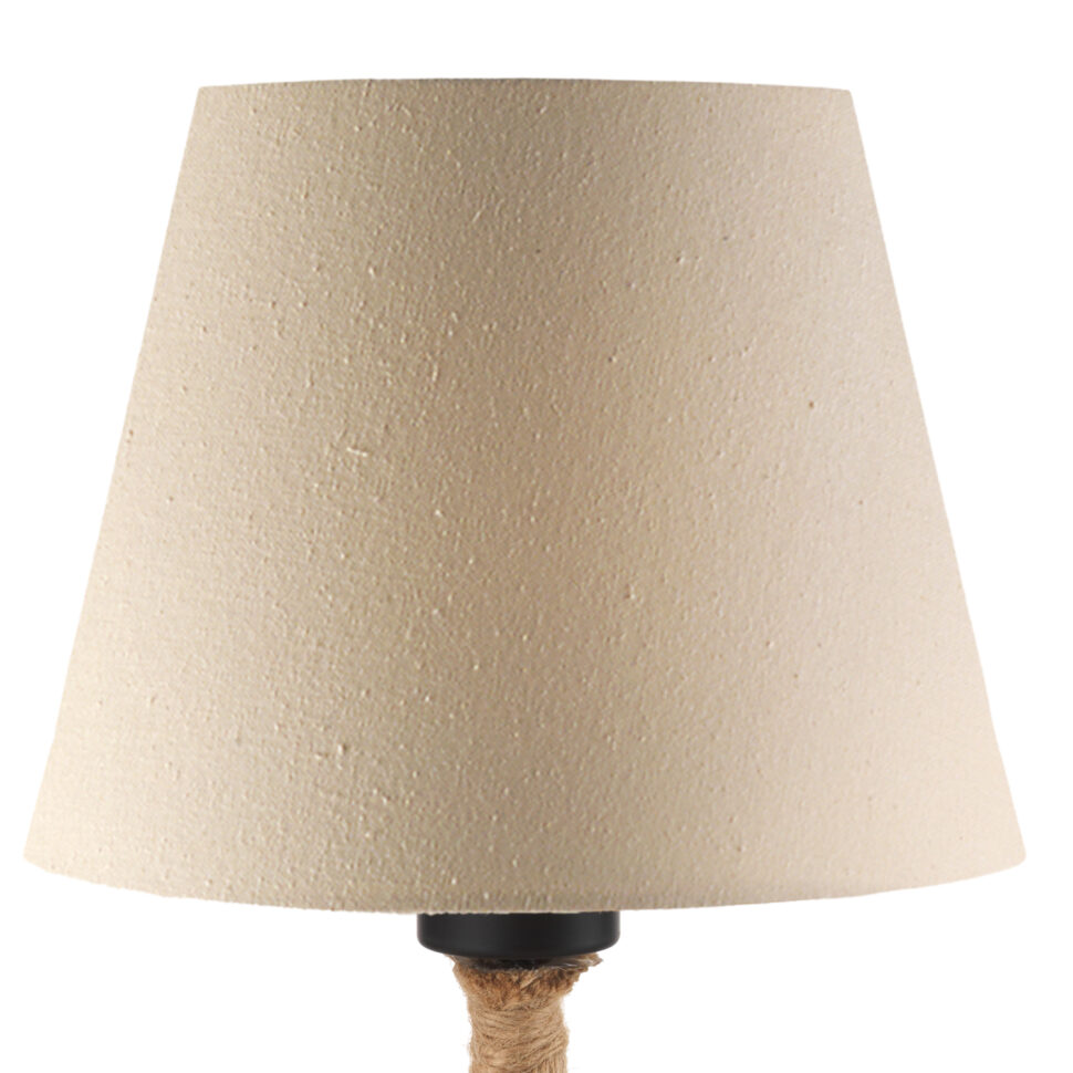 Lampada da tavolo con paralume beige e base in corda naturale. Altezza 35 cm. Ideale per ambienti semplici e in stile nature.