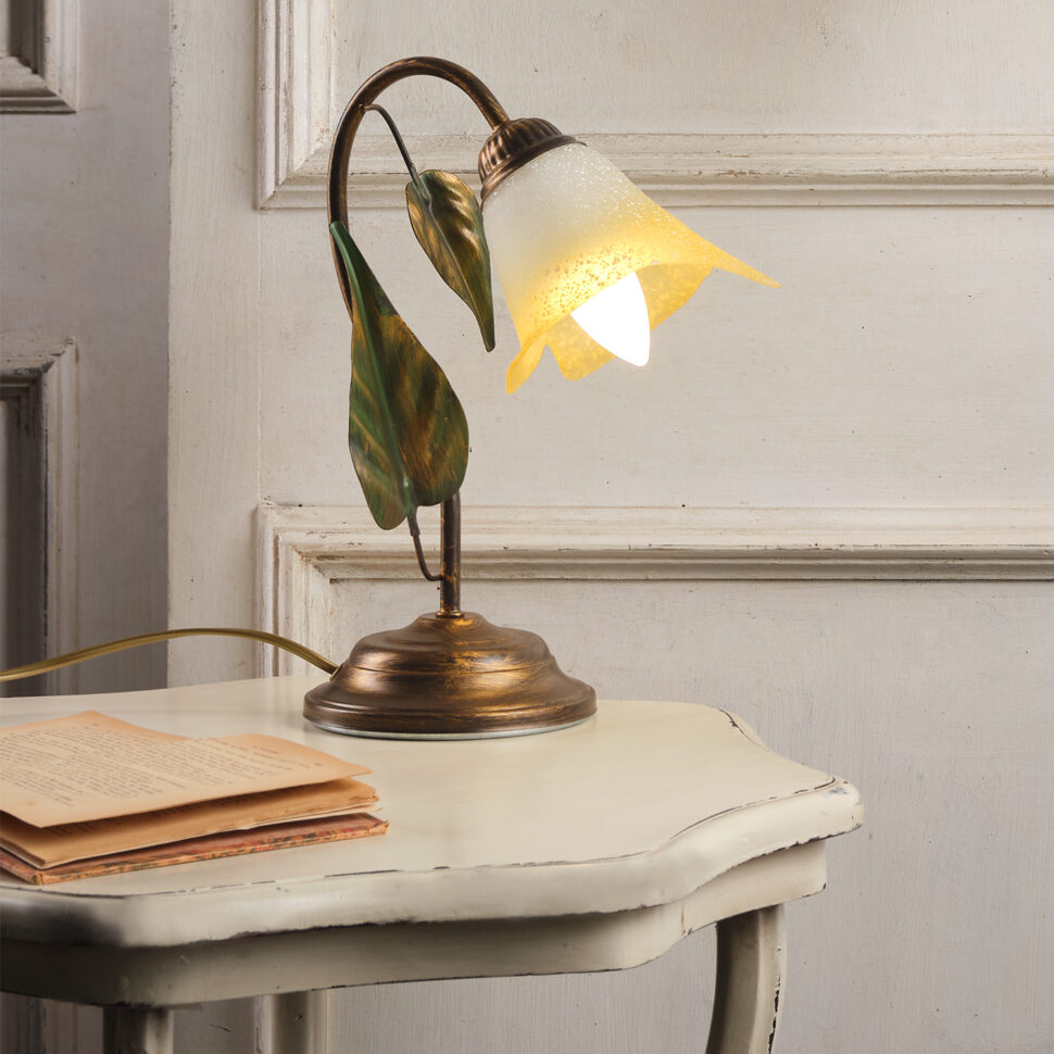 Lampada da tavolo a una luce con paralume rivolto verso il basso, a forma di calla bianco sfumato ambra con interno sabbiato. Struttura in bronzo spennellata oro lavorata a mano in Italia. Ad arricchire le forme essenziali, vi sono le foglie verdi. Altezza 30 cm. Ideale per zona giorno e zona notte. La musa ispiratrice della collezione Miranda è la natura. Le decorazioni sono foglie e fiori, le foglie sono verdi spennellate oro e di dimensioni differenti. I paralumi ricordano uno dei fiori più belli e sensuali, la calla. I paralumi sono in vetro bianco sfumato color ambra con interno sabbiato.