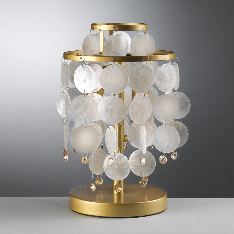 L'iridescenza del bianco perlaceo di queste decorazioni, che sono presenti in catene di varie lunghezze, ben si sposa con il color oro delle strutture, realizzate in metallo ed aventi come elemento strutturale comune degli anelli. Ciò significa che ciascun modello di lampada si compone di più livelli fatti ad anelli, dai quali non solo pendono i dischi luminosi, ma anche delle piccole gocce in vetro ambrato.
