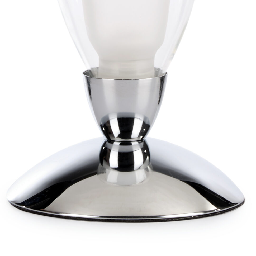 Lampada da tavolo a una luce. La struttura ricorda un fiore cui stelo termina con il paralume. Elegante e fine è perfetta per la zona notte.