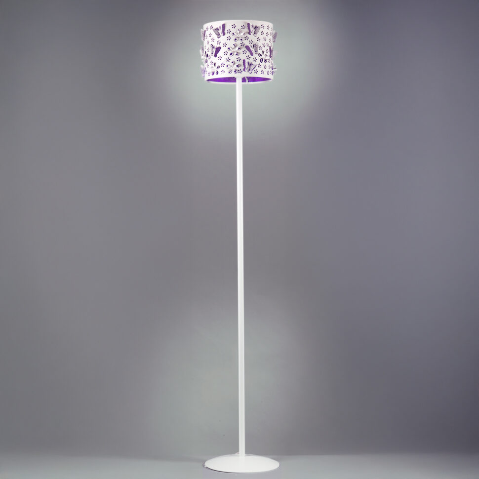 Lampada da terra a una luce in metallo bianco con interno viola. Il paralume è arricchito da decorazioni a taglio laser: fiori e farfalle 3D. Altezza 173 cm. Perfetta per soggiorno, studio, salotto e camera da letto.