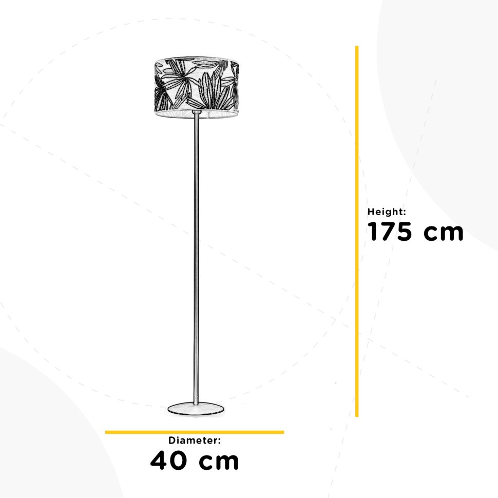 Lampada da terra ad 1 luce con attacco E27, altezza complessiva 175 cm. Lo stelo, slanciato ed elegante, è composto da una base circolare e un tubo in metallo marrone, su cui si innesta un paralume cilindrico dal diametro di 40 cm. Anche qui domina la carta da parati con decorazione floreale nelle tonalità bianco sporco, celeste e grigio scuro. Una piantana scenografica e raffinata, ideale per completare zone living, camere da letto o spazi di lettura.