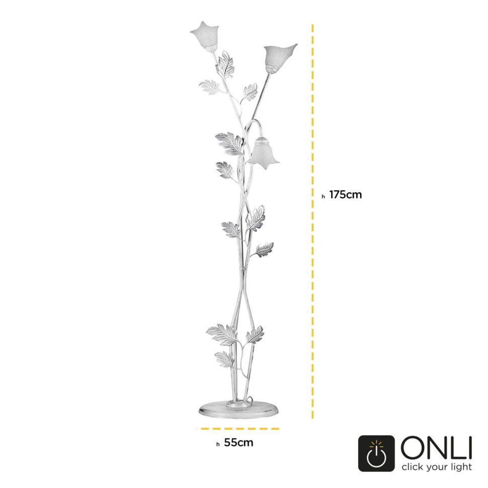 Lampada da terra a 3 luci. Paralumi in vetro bianco dall'interno satinato ed esterno decoro scavo. Struttura in metallo con foglie decorative. Perfetta sia per zona giorno che per zona notte.