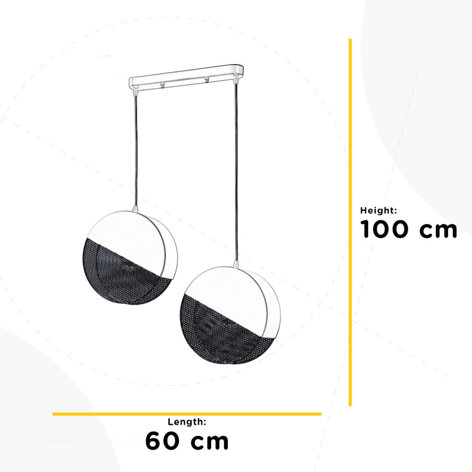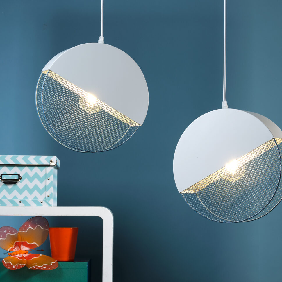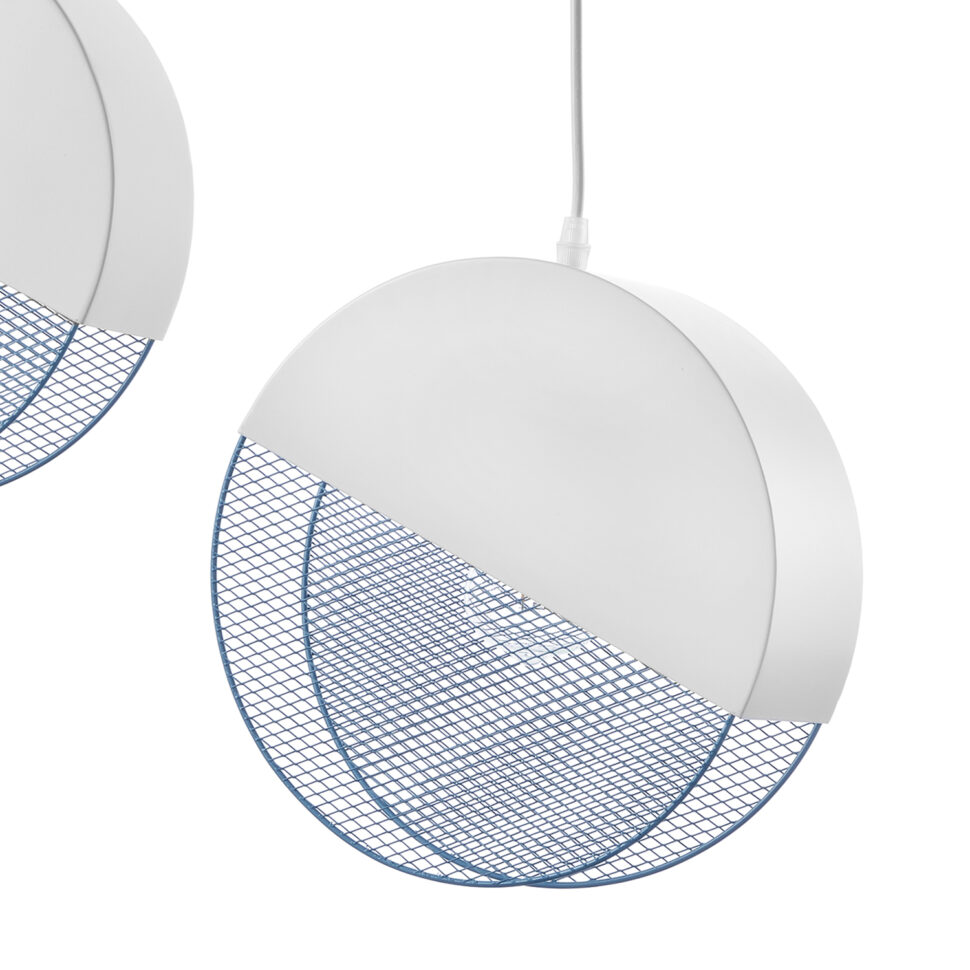 La sospensione Rollo si distingue per il suo design geometrico e contemporaneo: due diffusori a forma di disco sono sospesi da cavi regolabili e collegati a un supporto rettangolare. La struttura è in metallo bianco opaco, mentre la parte inferiore dei dischi è decorata da una retina color azzurro che lascia intravedere la lampadina e crea un effetto luminoso particolare. La combinazione del bianco con l’azzurro dona freschezza e leggerezza all’ambiente, rendendo questa sospensione ideale sopra un tavolo da pranzo, in cucina o in soggiorno.