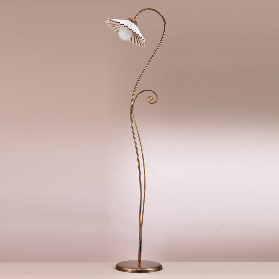 Lampada da terra a una luce con paralume plissé in ceramica color rosa chiaro con contorno bronzo che riprende il colore della struttura. Ideale per la zona giorno e camere da letto di ambienti rustici.