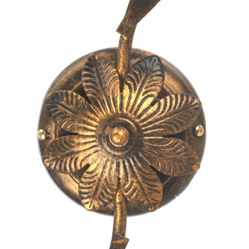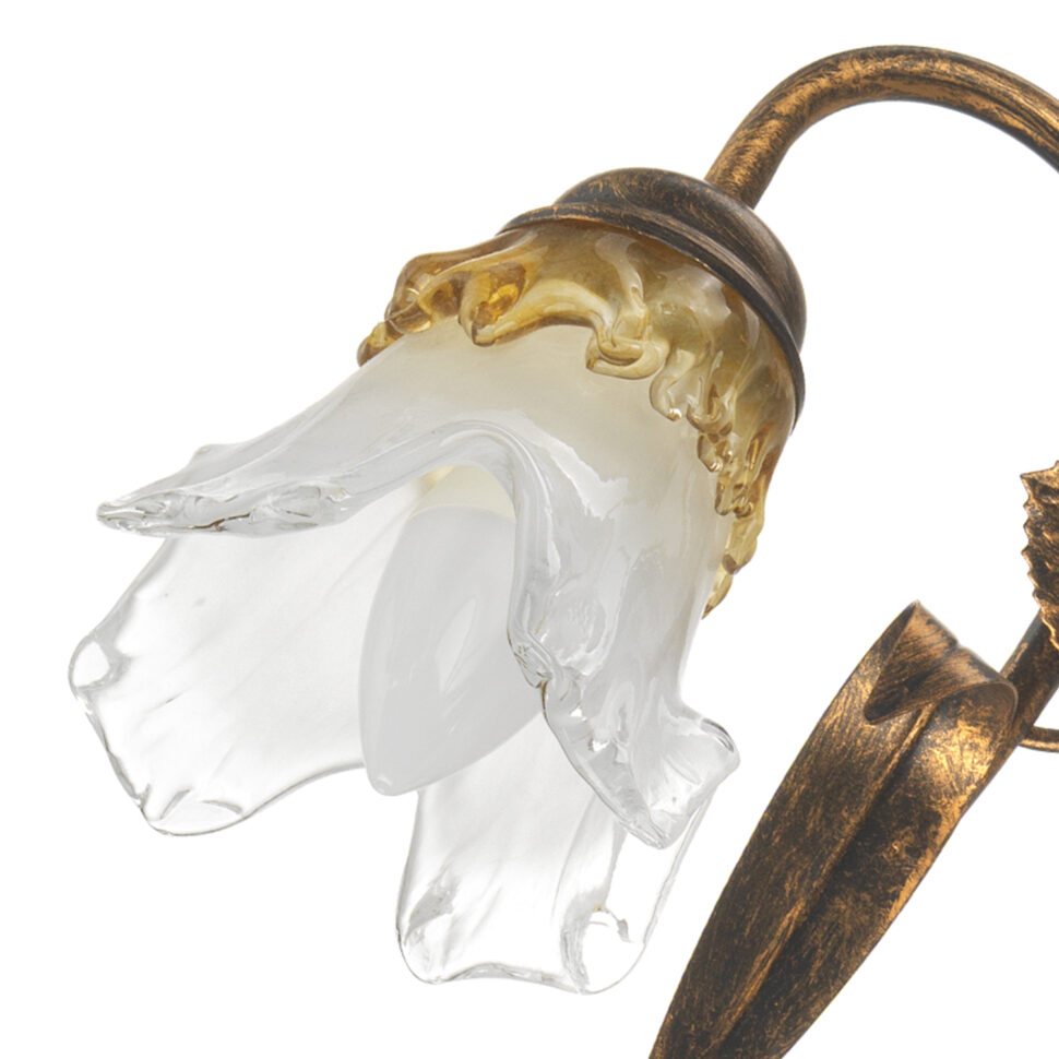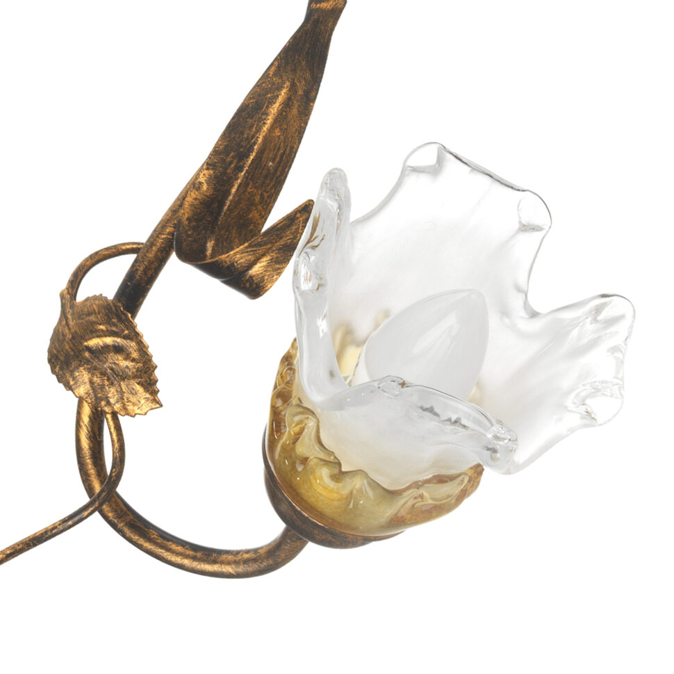 Ogni lampada della collezione Arianna racchiude in sé il fascino dello stile classico, racconta storie di altri tempi e si sposa bene con gli ambienti rustici. Le linee di questa collezione sono armoniose, hanno molteplici richiami floreali, tanto nella struttura quanto nei paralumi. La loro forma è infatti quella di un fiore, al cui interno si inserisce la lampadina che ne esalta i particolari. I paralumi sono realizzati in vetro soffiato e poi tirato a mano; il loro colore è il bianco, arricchito da una colatura ambrata. L’effetto luminoso che creano dona all'ambiente un tono caldo, intimo. Contribuiscono al calore dell'atmosfera anche le linee della struttura in ferro lavorato a mano, in quanto ricche di preziose decorazioni, quali foglie e boccioli dello stesso colore, vale a dire bronzo spennellato oro.