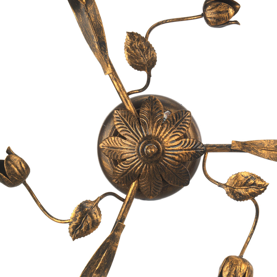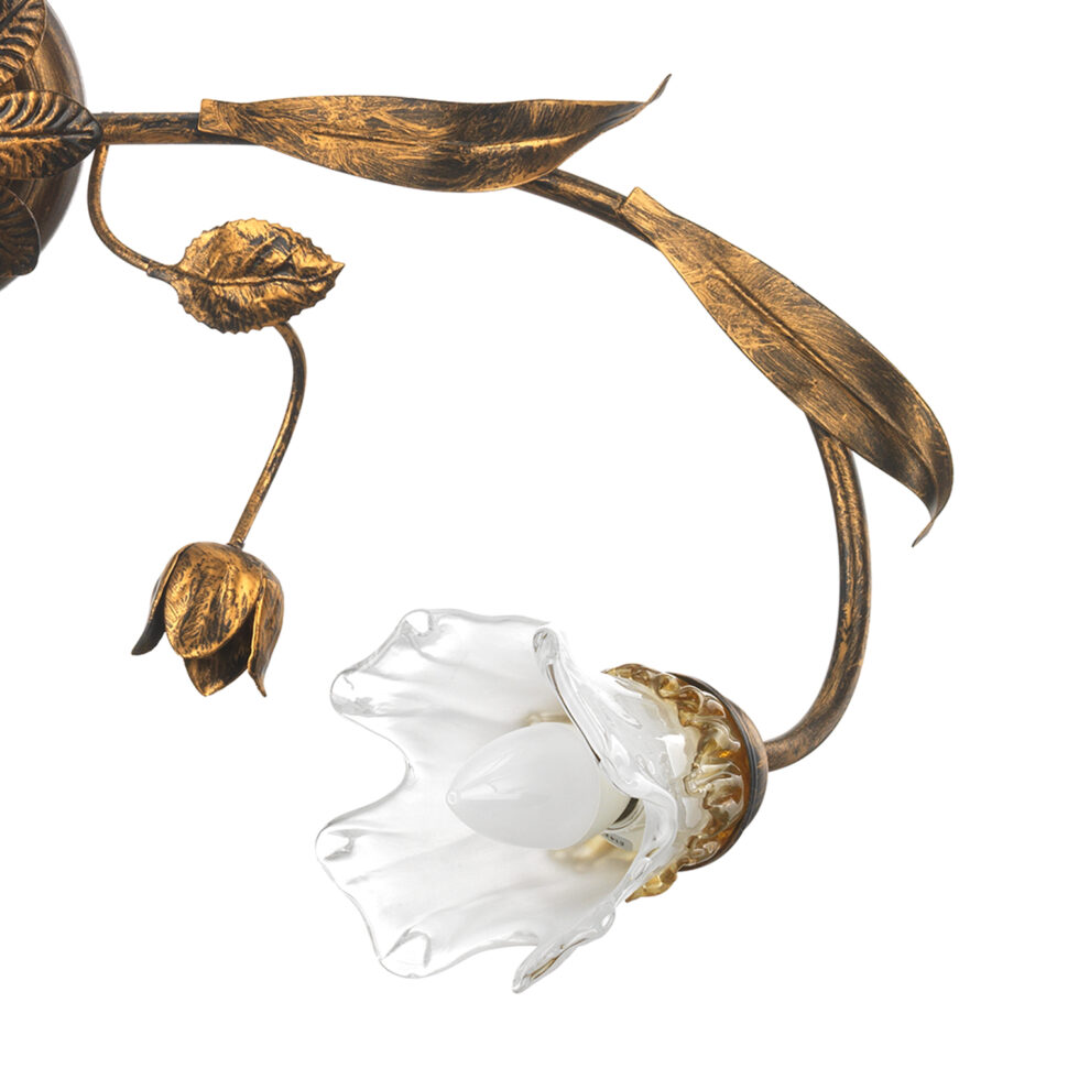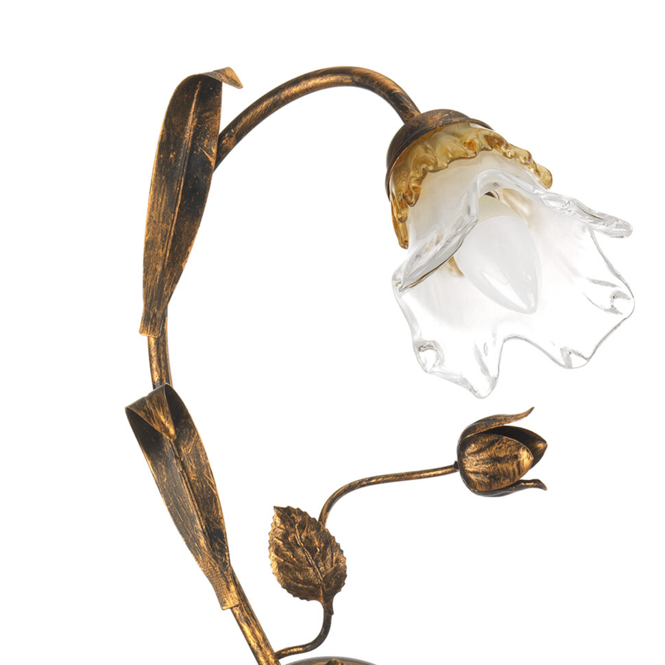 Ogni lampada della collezione Arianna racchiude in sé il fascino dello stile classico, racconta storie di altri tempi e si sposa bene con gli ambienti rustici. Le linee di questa collezione sono armoniose, hanno molteplici richiami floreali, tanto nella struttura quanto nei paralumi. La loro forma è infatti quella di un fiore, al cui interno si inserisce la lampadina che ne esalta i particolari. I paralumi sono realizzati in vetro soffiato e poi tirato a mano; il loro colore è il bianco, arricchito da una colatura ambrata. L’effetto luminoso che creano dona all'ambiente un tono caldo, intimo. Contribuiscono al calore dell'atmosfera anche le linee della struttura in ferro lavorato a mano, in quanto ricche di preziose decorazioni, quali foglie e boccioli dello stesso colore, vale a dire bronzo spennellato oro.