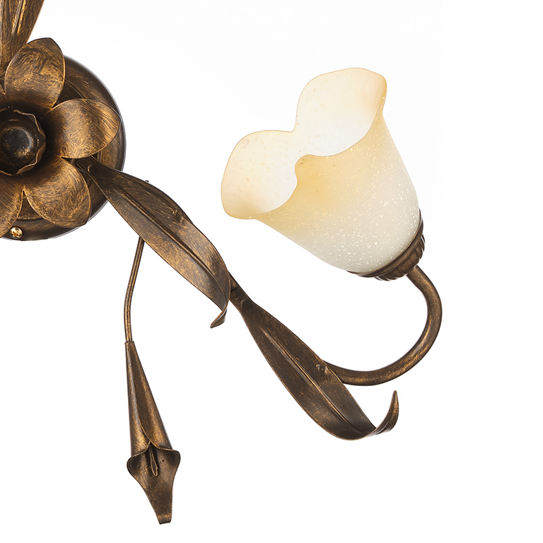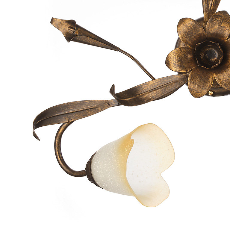 Scegliere la plafoniera a 3 luci della collezione Lucrezia bronzo significa scegliere di portare un delicato stile floreale classico a casa propria. Ogni singolo elemento è stato realizzato con cura, essi si sposano tutti alla perfezione l'un con l'altro. Parliamo di materiali, di decorazioni, ma anche di design e di movimenti. A tal proposito diciamo che le luci convergono verso il centro, dove cioè vi è un gran bel fiore. Il fiore è in ferro, è posto nella struttura di base color bronzo. Ma non si tratta dell'unico elemento decorativo, a dare ulteriore movimento vi sono 3 foglie e 3 calle, che sono sempre tutte in ferro e sono tutte dello stesso colore. I paralumi sono a forma di calla e sono stati realizzati in vetro, il loro colore è un bianco sfumato ambrato.