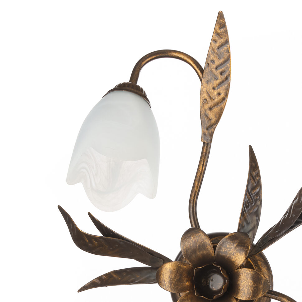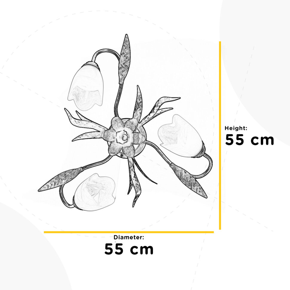 Lampada da soffitto a 3 luci con paralumi rivolti verso il centro. Foglie e fiore decorativi in metallo. Perfetta per il bagno e la zona giorno. Plafoniera con attacchi E14, diametro 55 cm.